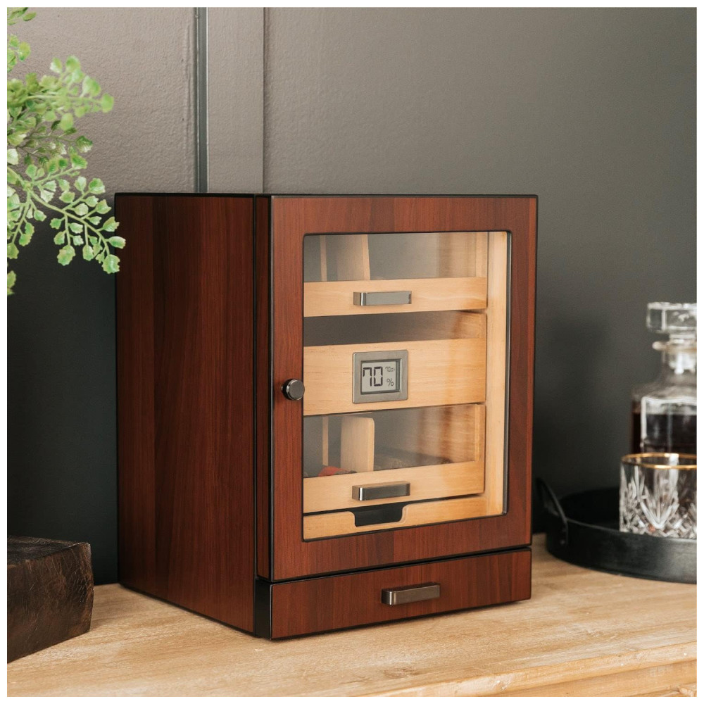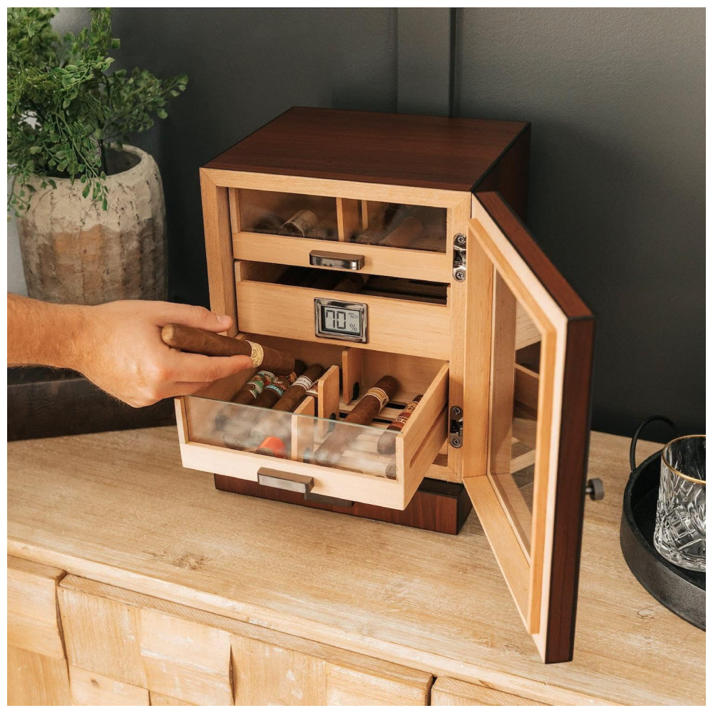 Grande Capacidade de Armazenamento: Este armário umidor armazena de 80 a 100 charutos em três gavetas totalmente removíveis com frentes de vidro temperado real. Cada gaveta possui o sistema patenteado PEG, oferecendo flexibilidade para organizar seus charutos como preferir.