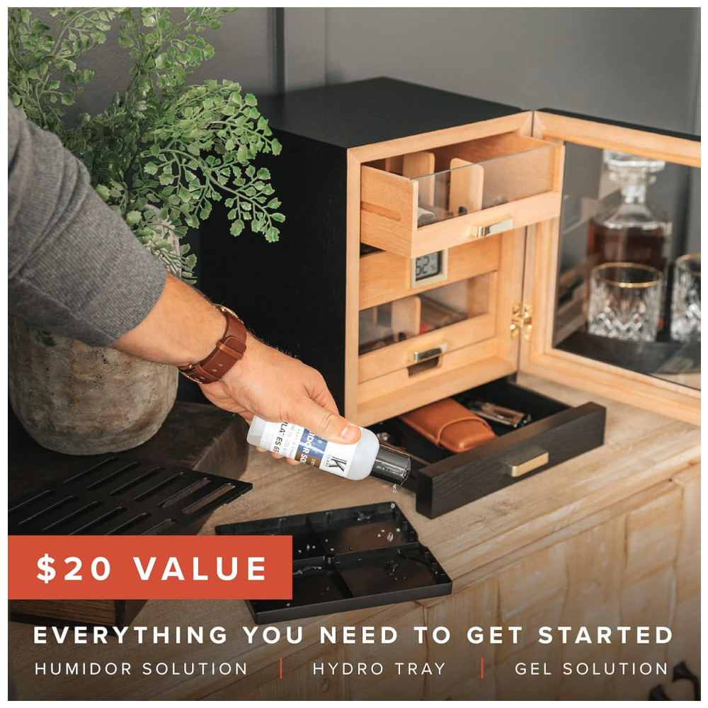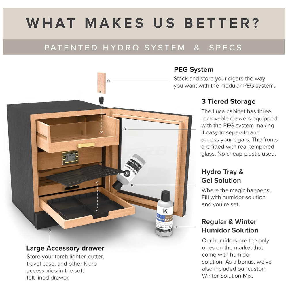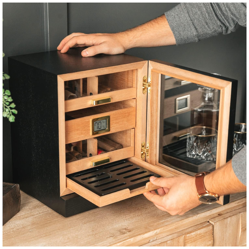 Este umidor de armário possui capacidade para armazenar entre 80 e 100 charutos em três gavetas completamente removíveis com frentes de vidro temperado real. Cada gaveta apresenta nosso sistema patenteado PEG, permitindo que você organize e armazene seus charutos da maneira que preferir. Além disso, conta com uma gaveta adicional para facilitar o acesso à Bandeja Hydro, evitando a necessidade de manusear ou remover charutos para recarregar a solução de umidificação. A porta de vidro do tipo armário possui vedação magnética de alta qualidade, garantindo excelente hermeticidade. O umidor conta com uma parede traseira espessa de cedro espanhol para regular a umidade interna, resultando em menos manutenção e melhor desempenho. Além disso, possui uma gaveta exclusiva para acessórios, possibilitando armazenar isqueiros, estojos de viagem, cortadores de charutos e outros itens essenciais, tudo em um único local, mantendo-os organizados e protegidos.