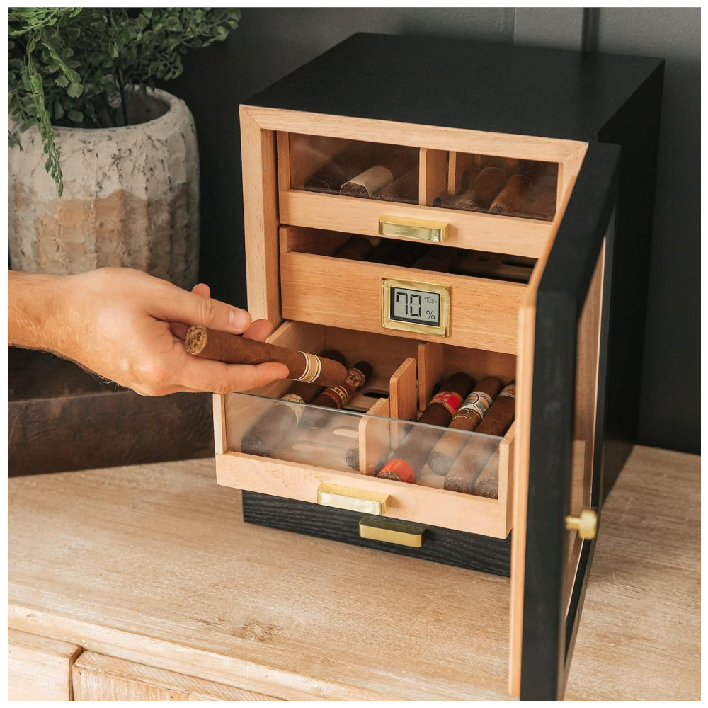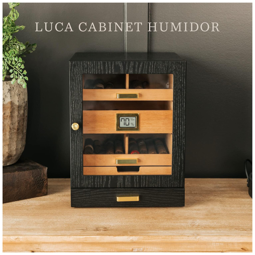 Umidor de Armário CASE ELEGANCE Luca para 80-100 Charutos Caixa com Cedro Espanhol Display de Vidro Sistema de Umidificação Fácil Higrômetro Digital Preto