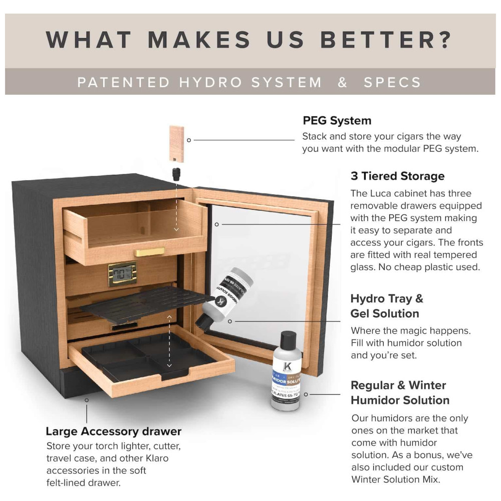 Com o umidor de Armário Luca da CASE ELEGANCE, você terá espaço para armazenar de 80 a 100 charutos em três gavetas removíveis com frente de vidro temperado real. Cada gaveta possui nosso sistema exclusivo PEG, permitindo que você organize seus charutos da maneira que preferir. O design inovador inclui uma gaveta extensível para fácil acesso ao Hydro Tray, facilitando o abastecimento sem precisar movimentar ou retirar os charutos. A porta de vidro com fecho magnético oferece a melhor vedação, garantindo a integridade do ambiente interno. O cedro espanhol de 5mm de espessura ajuda a regular a umidade dentro do armário, resultando em menos manutenção e melhor desempenho. Além disso, o Humidor Luca conta com uma gaveta exclusiva para acessórios, onde você pode armazenar isqueiros, cortadores de charuto e outros itens essenciais com facilidade.