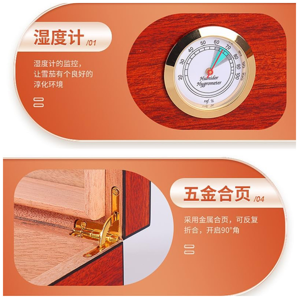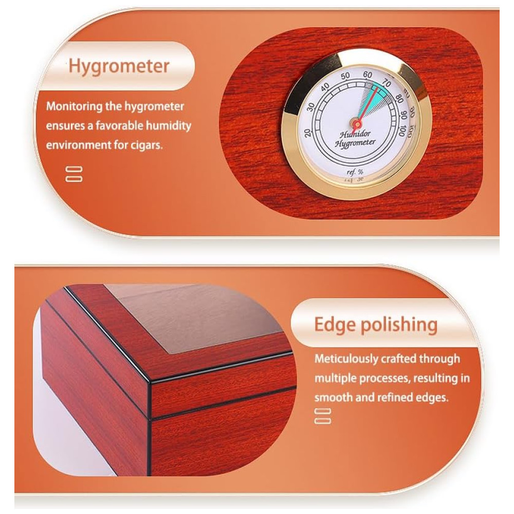 Mantenha seus charutos sempre frescos com o nosso estojo de charuto cuidadosamente elaborado. O revestimento premium de cedro espanhol oferece controle ideal de umidade, enquanto o selo seguro mantém o equilíbrio perfeito de umidade para uma experiência de charuto incomparável. Nosso porta-charutos dispõe de um higrômetro analógico preciso, que permite monitorar e manter os níveis ideais de umidade para seus charutos. Além disso, é um dos acessórios de charuto mais refinados, garantindo a experiência de fumar perfeita. Surpreenda qualquer apreciador de charutos com nosso requintado umidor. Com um design meticulosamente trabalhado com elegância artesanal, possui um painel em tons de marrom avermelhado e dobradiças folheadas a ouro, tornando-o um presente excepcional para os amantes de charutos. Mergulhe na exímia artesanía do nosso umidor de charutos em cedro espanhol. Seu belo design, combinado com os melhores materiais e atenção aos detalhes, impressionará você e seus convidados. Com capacidade ideal para 25 a 50 charutos, dependendo do tamanho do aro, nossos umidores mantêm a coleção de charutos organizada e fresca. O divisor removível de cedro garante uma organização fácil, tornando-o um acessório indispensável para qualquer apreciador de charutos.