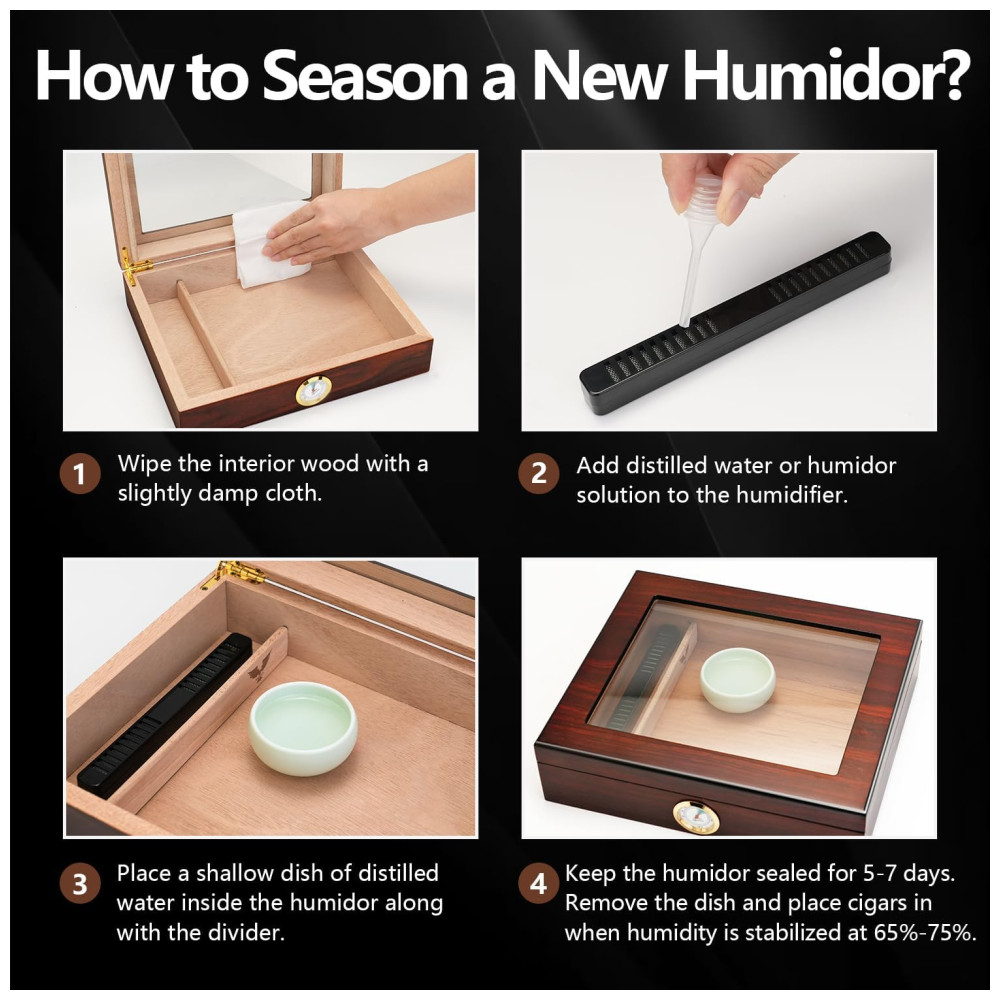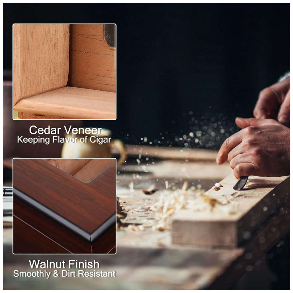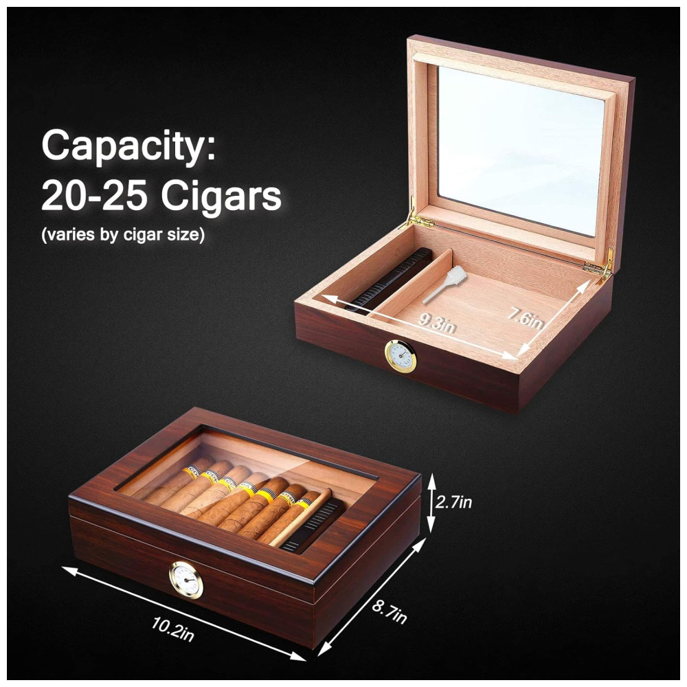Feito artesanalmente com a melhor madeira genuína de cedro espanhol, este umidor pode armazenar até 25 charutos. Com um acabamento rico em Nogueira, tampa de vidro e design deslumbrante, este umidor de charutos vem com um umidor de charutos, humidificador, higrômetro e uma pequena placa divisória móvel para manter os charutos no lugar. Possui um revestimento preto de veludo anti riscos na parte inferior para proteger a caixa de umidor de madeira contra danos por atrito. O presente perfeito para Pai, Marido, Idosos e bons Amigos. O local de descanso ideal para seus charutos em casa, em movimento ou no escritório. Sugere-se colocar sua caixa de charutos em um ambiente mais fresco.
