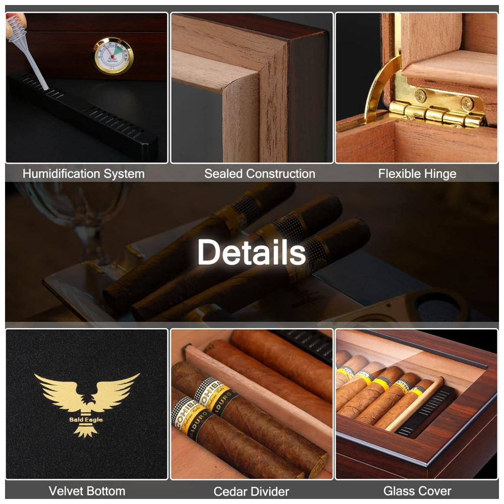 Umidor de Charutos Artesanal Bald Eagle Caixa de Cedro para Charutos com Humidificador e Higrômetro Tampa de Vidro para 25 Charutos
