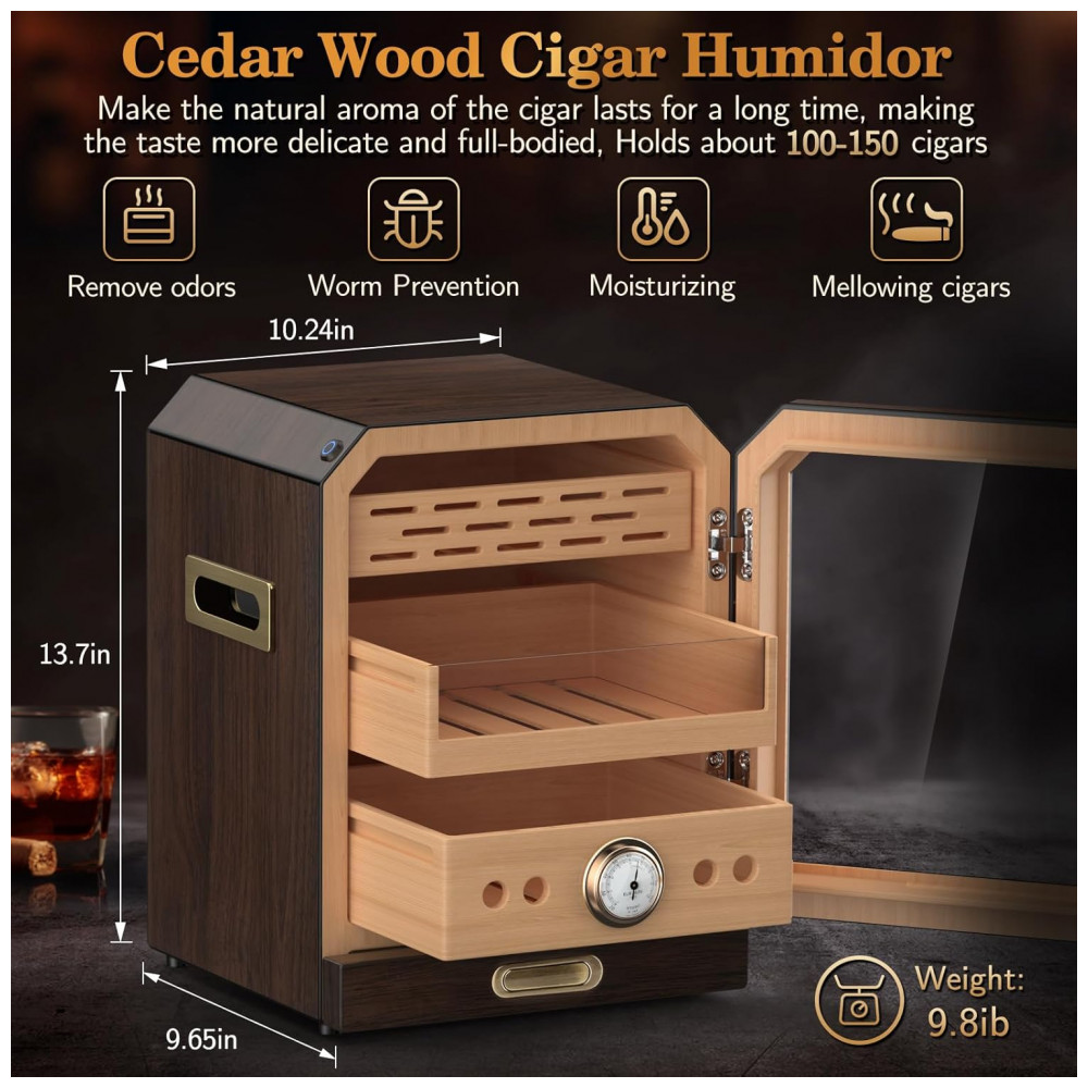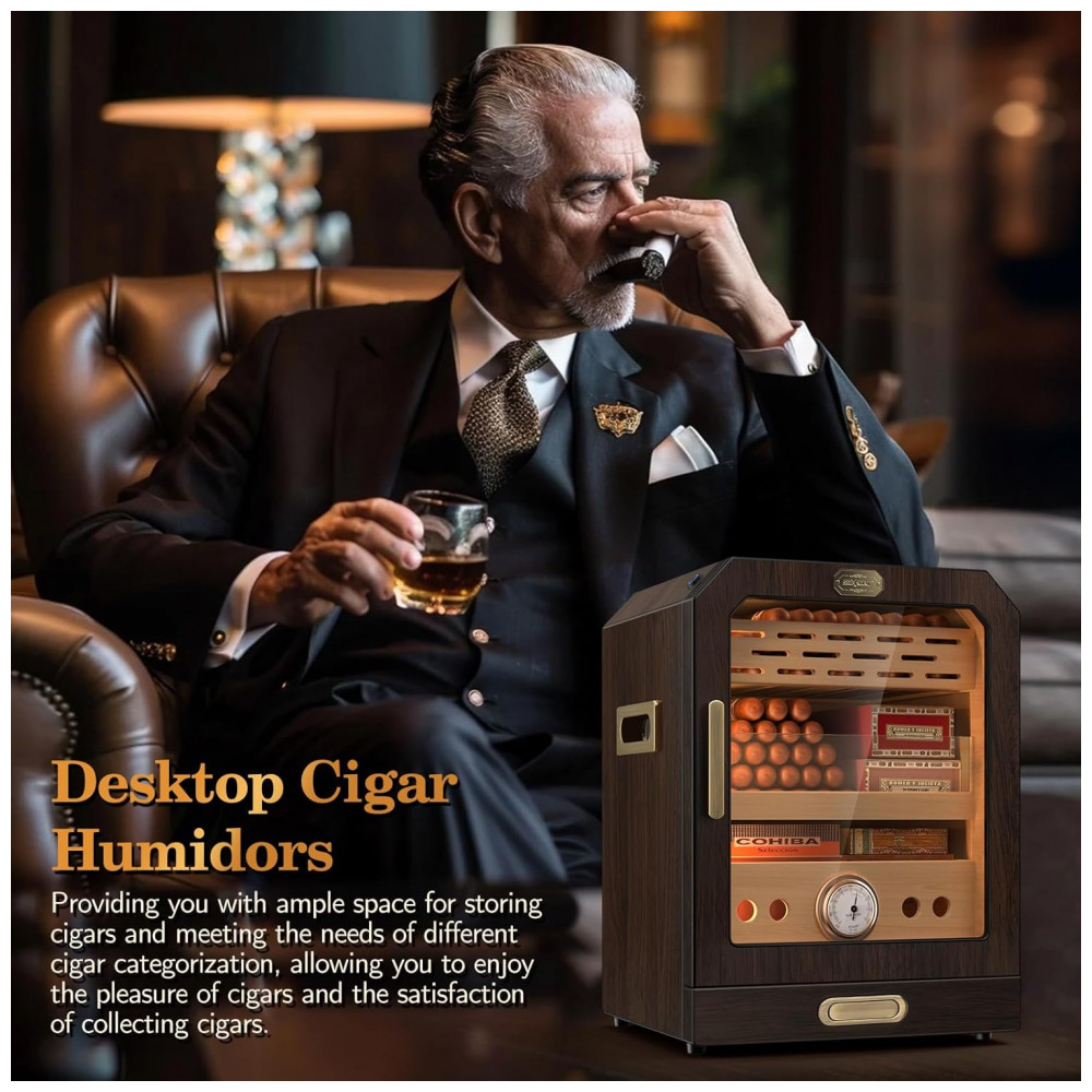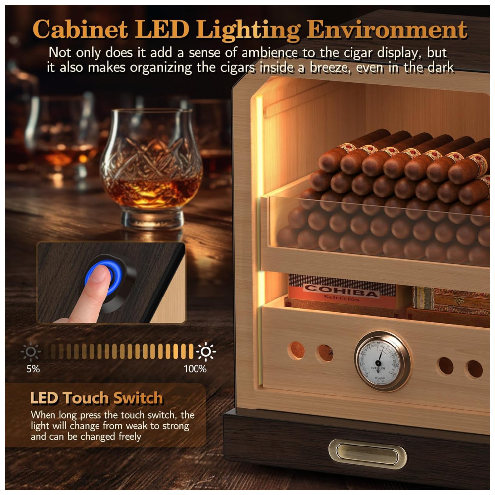 Design Elegante: O armário é feito de madeira de cedro espanhol de alta qualidade, com um aroma natural que mantém seus charutos frescos, hidratados e livres de odores. A cor do grão de madeira, acabada com esmalte de alta temperatura e superfície polida, confere um estilo luxuoso e refinado. A iluminação LED no topo pode ser ajustada para intensidade, permitindo o uso noturno e a exibição dos seus charutos, mesmo no escuro.