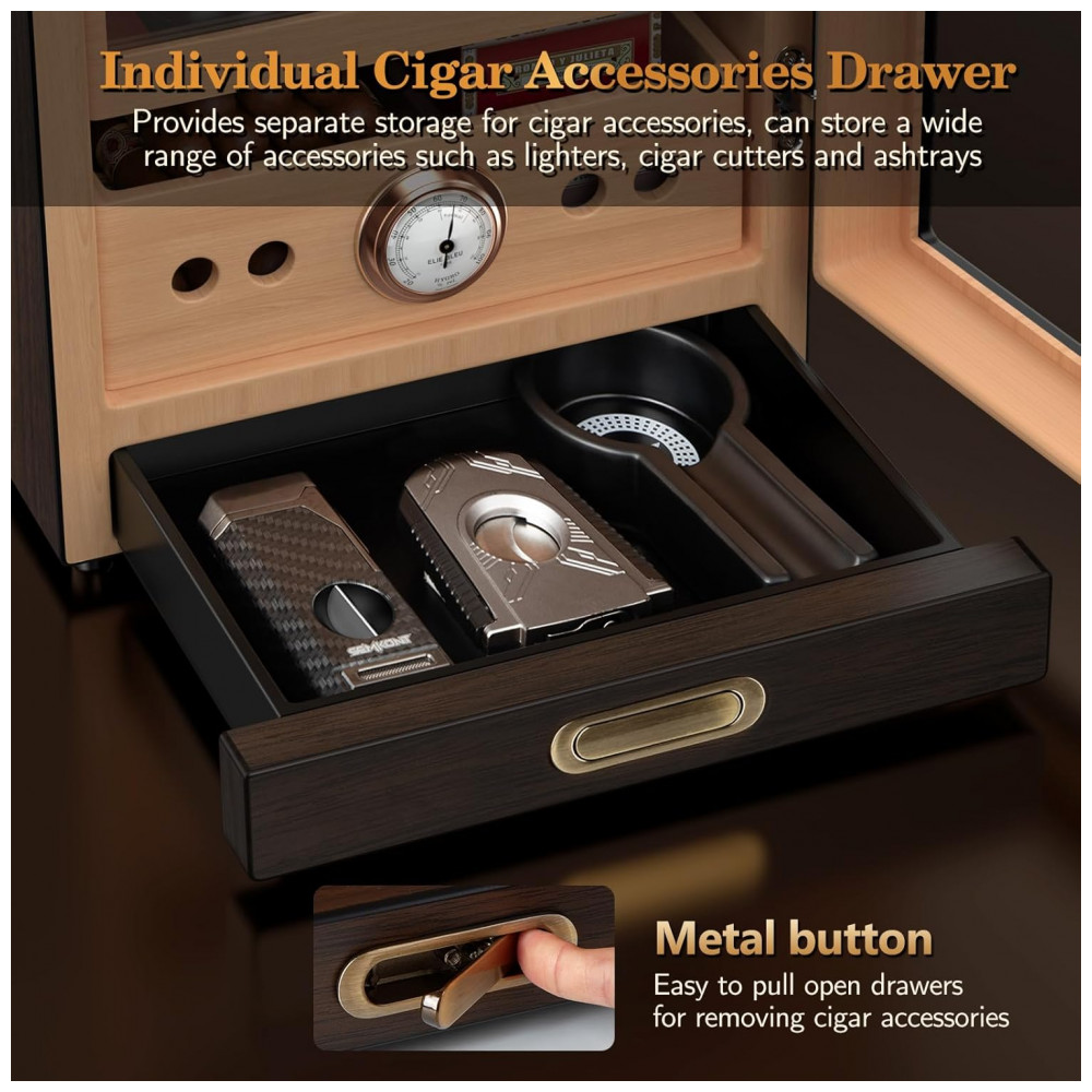 Ampla Capacidade de Armazenamento: O armário possui 3 prateleiras de cedro com capacidade diferente para armazenar uma variedade de charutos, suportando de 100 a 150 charutos, dependendo do diâmetro do anel. Na parte inferior, há uma gaveta para acessórios, como isqueiro, cortador de charutos e cinzeiro, com botões metálicos para fácil acesso.