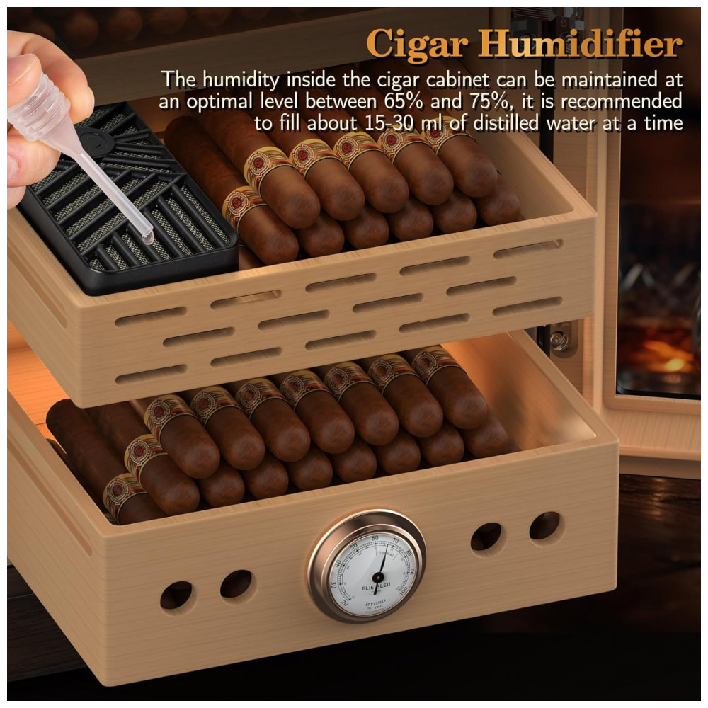 Controle de Umidade Preciso: O armário conta com um termômetro digital de precisão embutido no gavetão inferior para monitorar a umidade interna. Com dois umidificadores inclusos, ele mantém a umidade ideal (entre 65% e 75%) para o armazenamento dos seus charutos. Basta adicionar água destilada ou solução de umidificação para preservar a qualidade do sabor dos charutos.
