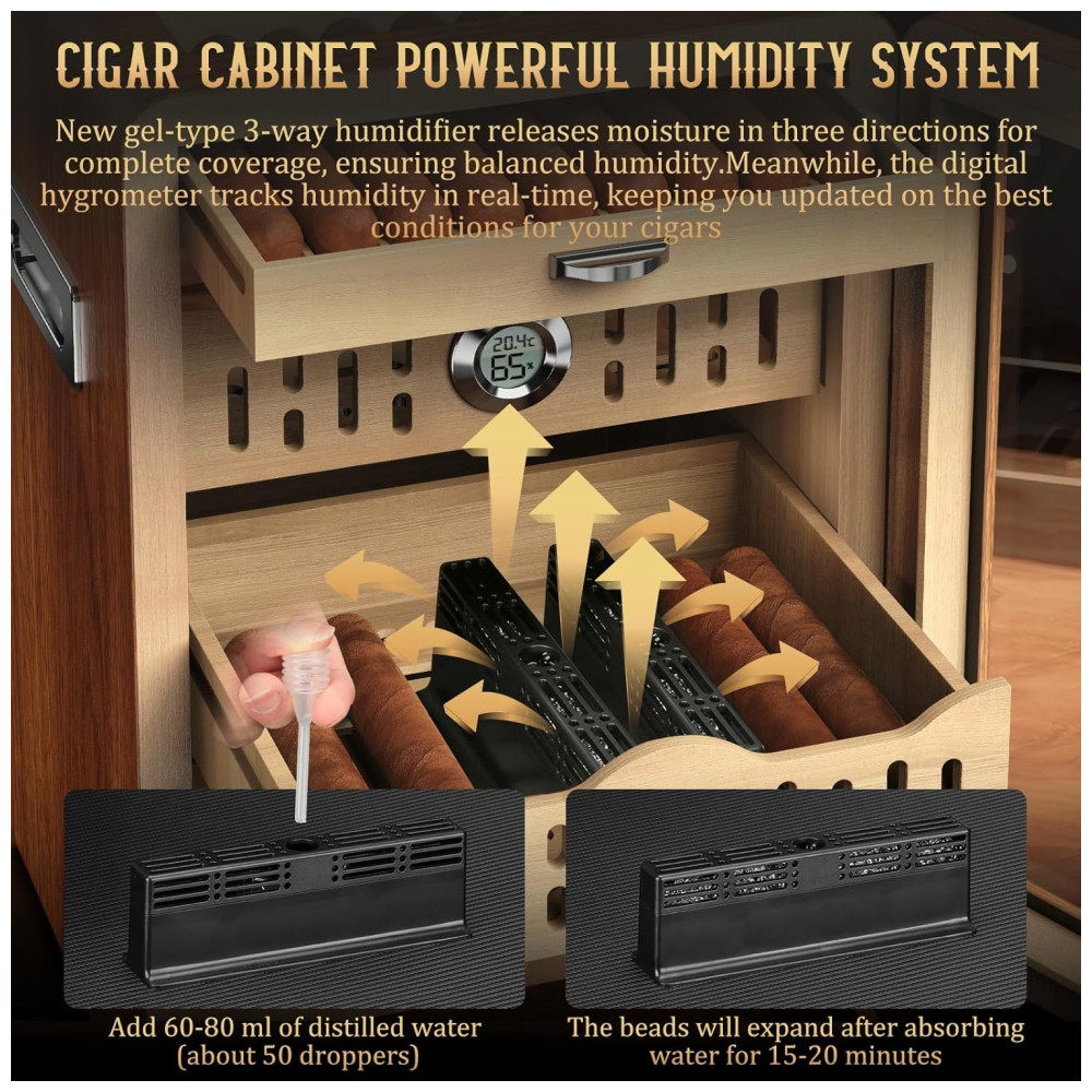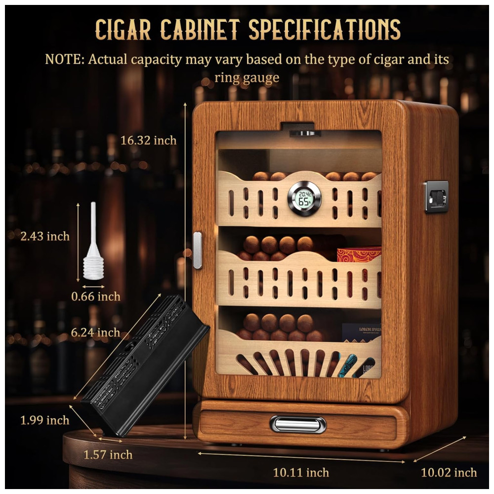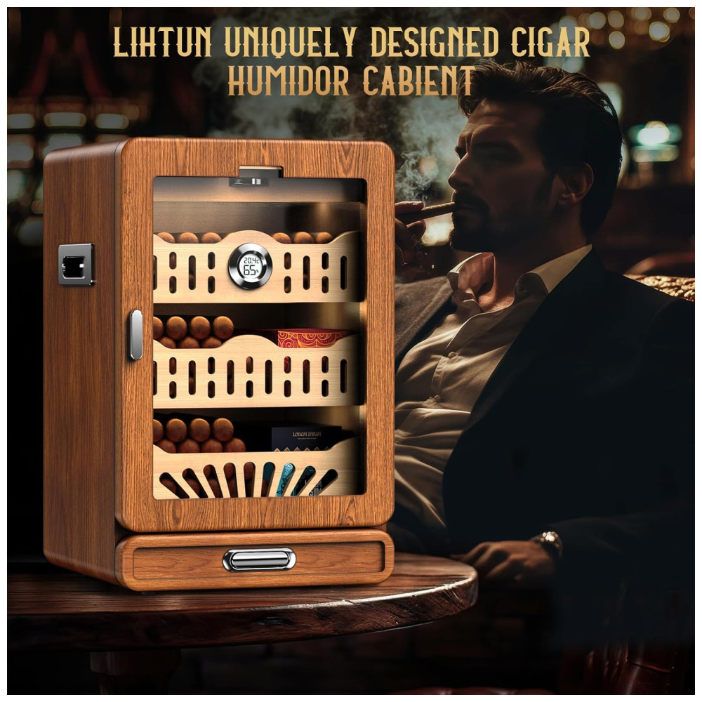Cabinete umidor com Tampa e Porta de Vidro Transparente: Este umidor de charutos apresenta um design com tampa de vidro temperado e porta de vidro, permitindo visualizar os charutos sem precisar abrir o gabinete. A tampa de vidro facilita o monitoramento da condição dos charutos, garantindo umidade ideal. O umidor LIHTUN combina elegância e funcionalidade, oferecendo uma bela exibição para sua coleção de charutos, ao mesmo tempo em que simplifica a manutenção diária, tornando-se uma escolha perfeita para um estilo de vida sofisticado.