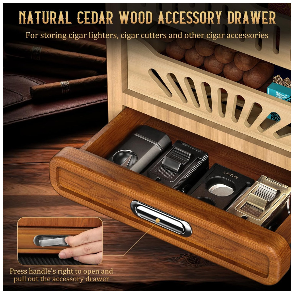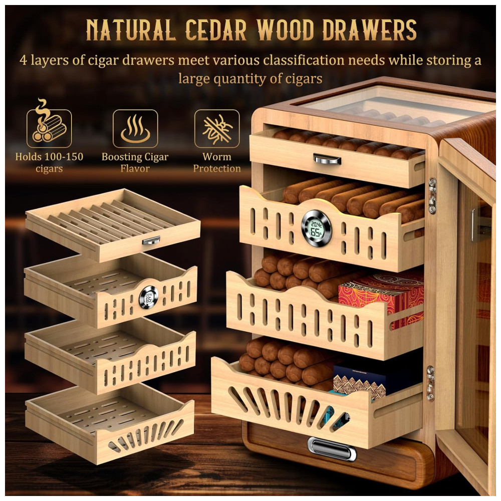 Design de Armazenamento com 5 Camadas: O umidor possui 4 bandejas de madeira de cedro com diferentes capacidades. A bandeja superior tem um design vazado e comporta até 9 charutos. Combinada com as 3 bandejas de cedro vazadas inferiores, é possível armazenar aproximadamente 100-150 charutos (a capacidade real pode variar conforme o calibre do anel). A parte inferior do gabinete possui uma gaveta com alça retrátil para armazenar facilmente seu isqueiro de charuto, cortador, perfurador e outros acessórios ou colecionáveis. O design flexível permite personalizar o espaço de armazenamento sem esforço, garantindo que sua coleção esteja sempre organizada.