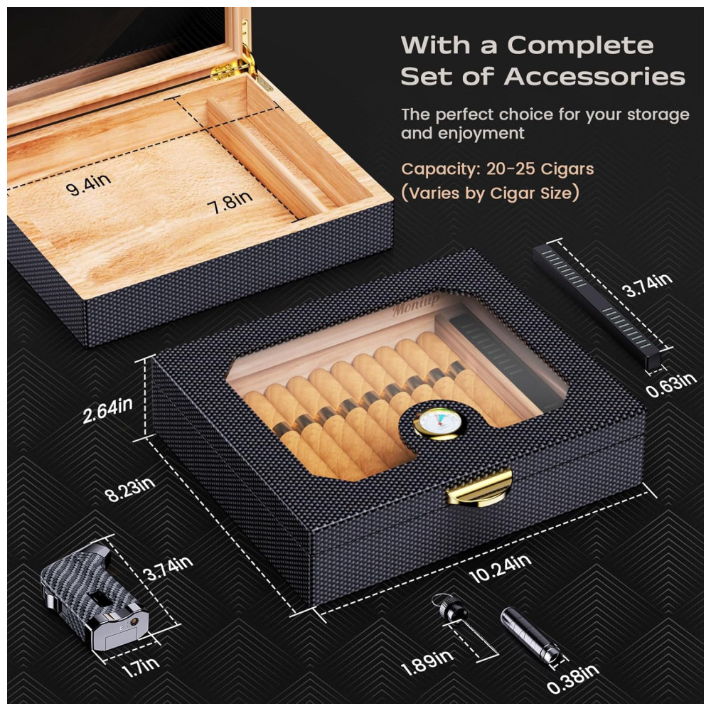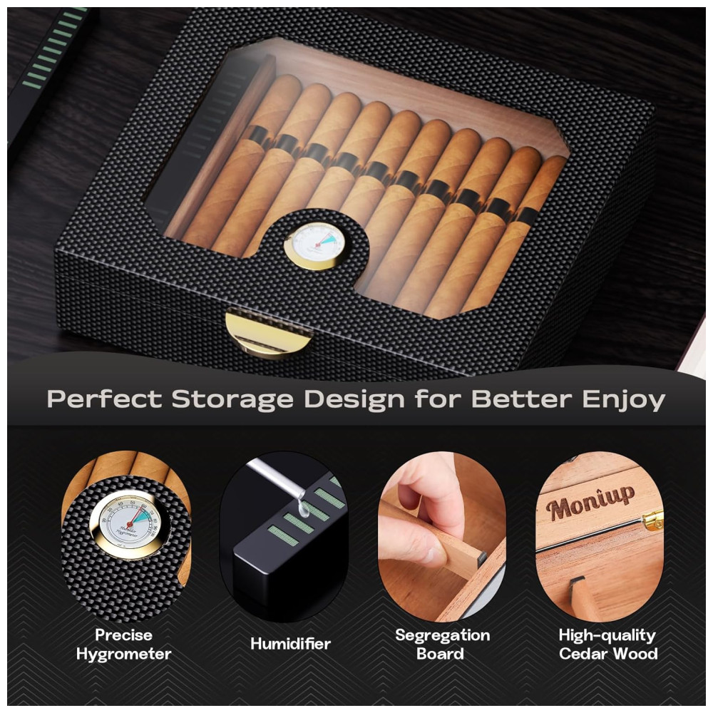 Umidor de Charutos Moniup Revestido com Cedro com Isqueiro VCut e Ferramenta 2 em 1 para Melhora do Fluxo Higrômetro Umidificador Caixa de Charutos para Armazenar até 30 Charutos