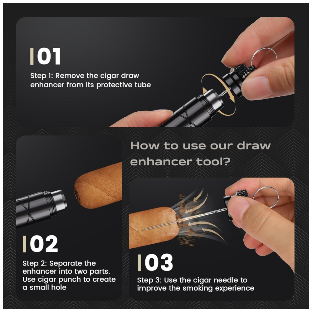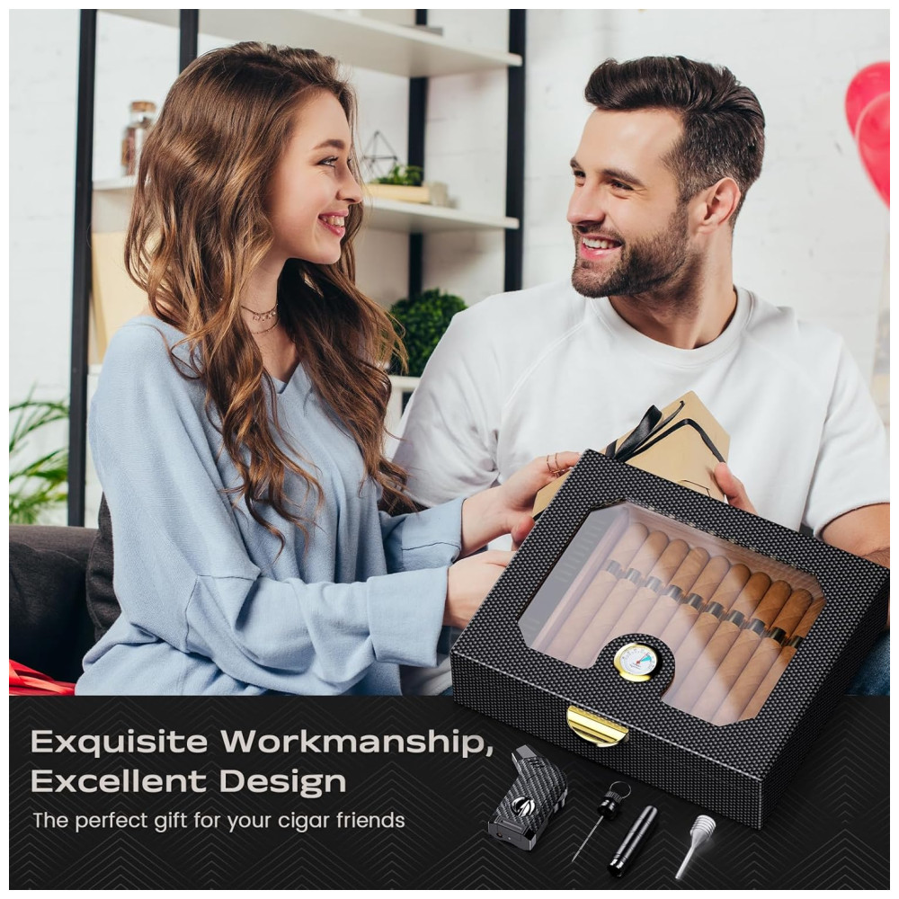 Design de artesanato requintado! Este umidor de charutos é feito de cedro premium, ideal para armazenar charutos. Possui um divisor interno de cedro para organizar charutos e acessórios. A janela transparente no topo permite exibir claramente sua coleção de charutos e monitorar as condições. Adicionamos uma borda interna e um design selado para manter a umidade. A pintura perfeita facilita a limpeza. Equipado com higrômetro e um umidificador preciso para controle ideal da umidade. Acompanha uma ferramenta 2 em 1 para melhorar o fluxo e um isqueiro 3 em 1. Um conjunto profissional de acessórios para charutos! Um presente dos sonhos para amantes de charutos! Esta caixa exibe um visual de fibra de carbono, transmitindo luxo. Ótimo para clubes e festas. Um presente perfeito para Dia dos Namorados, aniversários, Natal e outras ocasiões especiais.