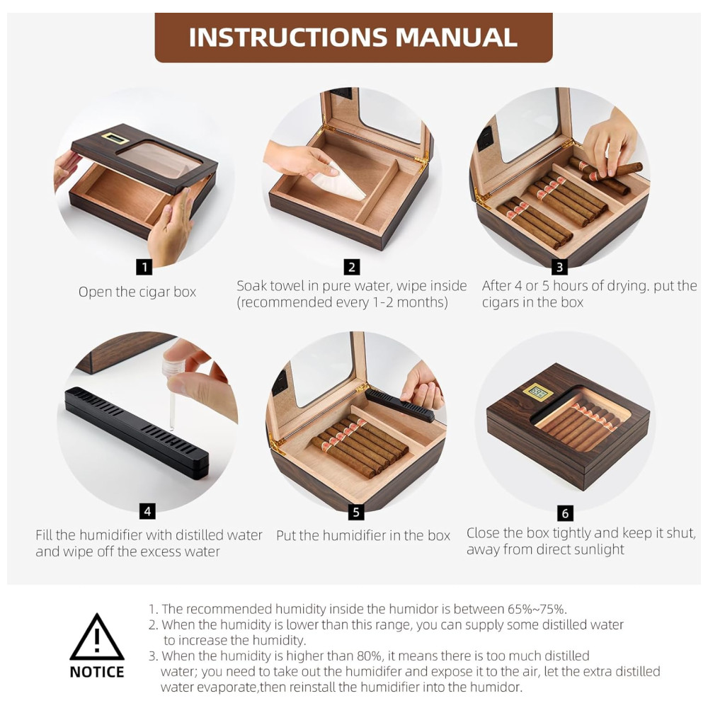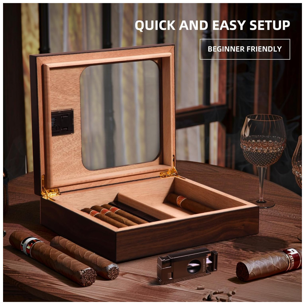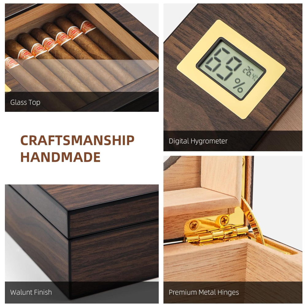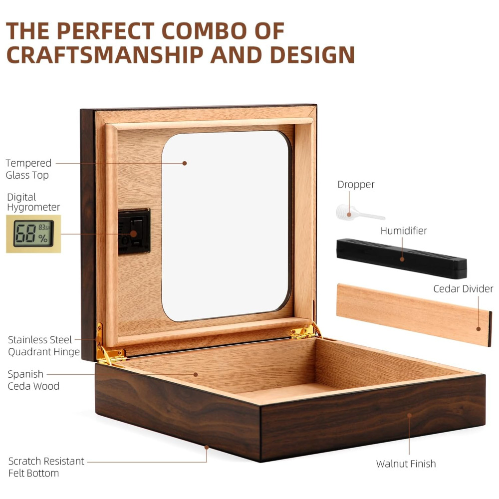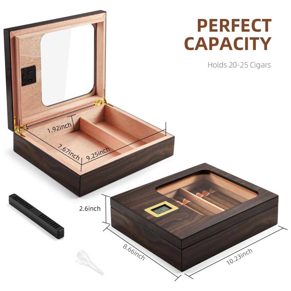 Umidor de Charutos OTAKOKIT com Design Moderno de Vidro Caixa de Cedro com Higrômetro Digital Umidificador Divisor Estojo Artesanal para 20-25 uni.