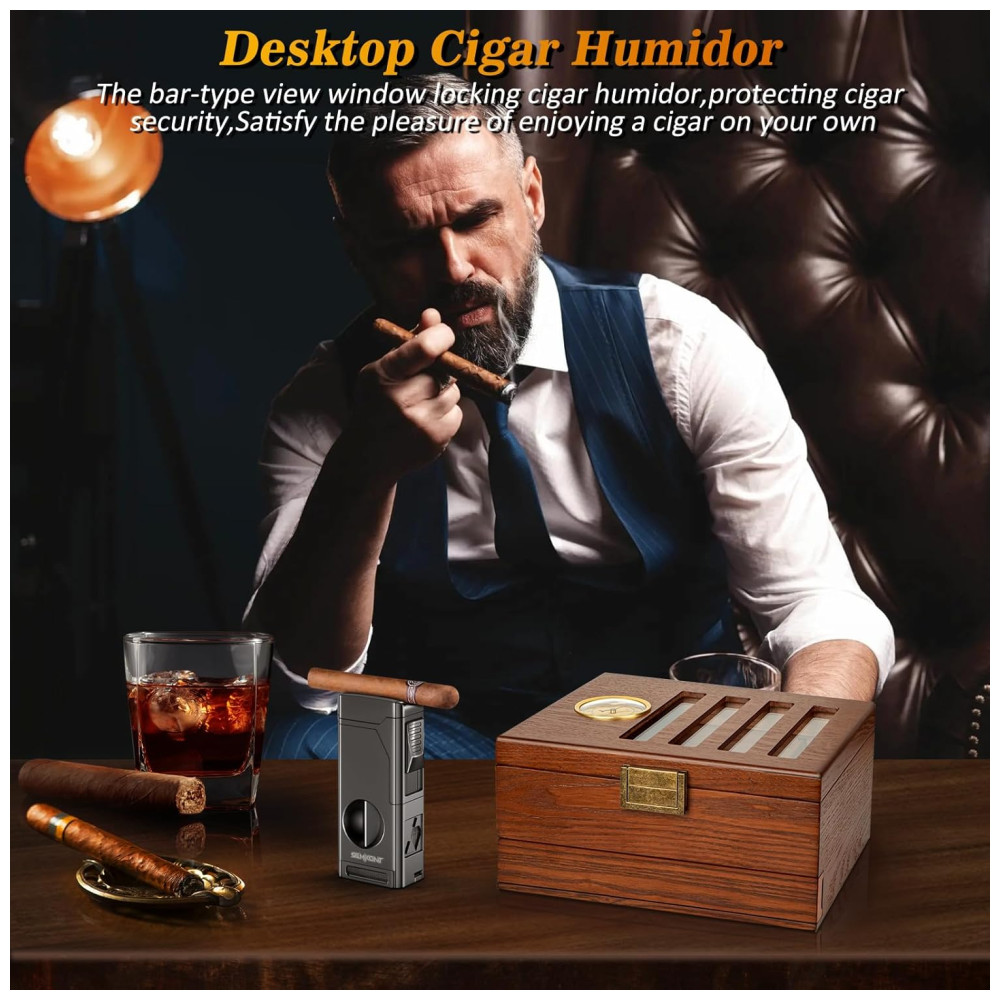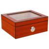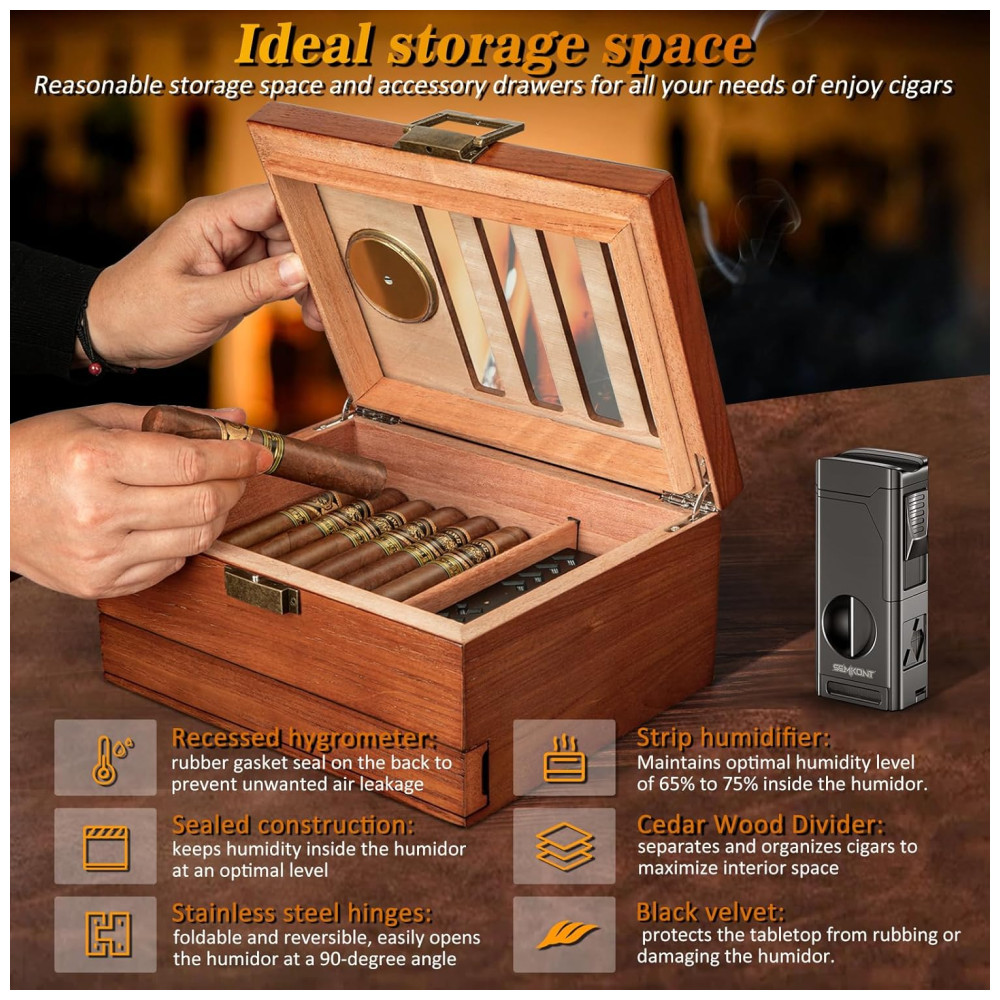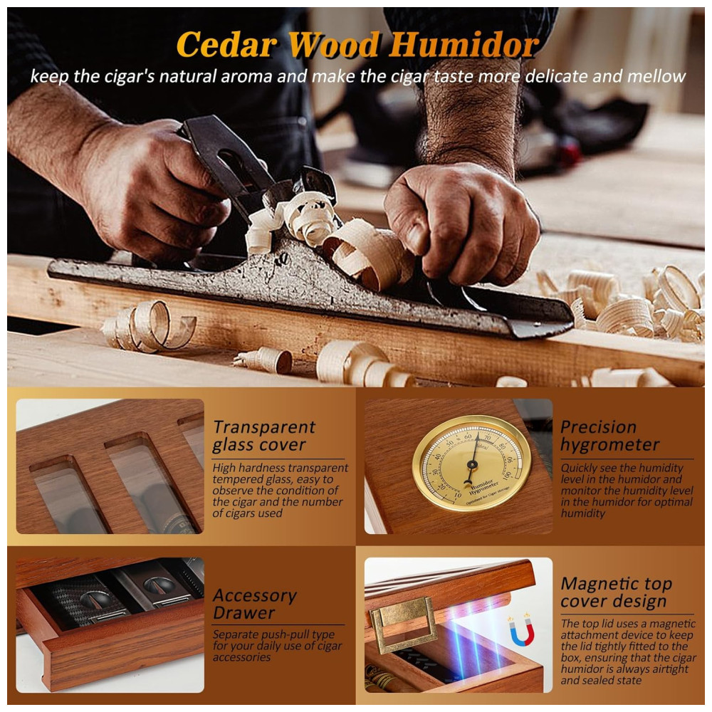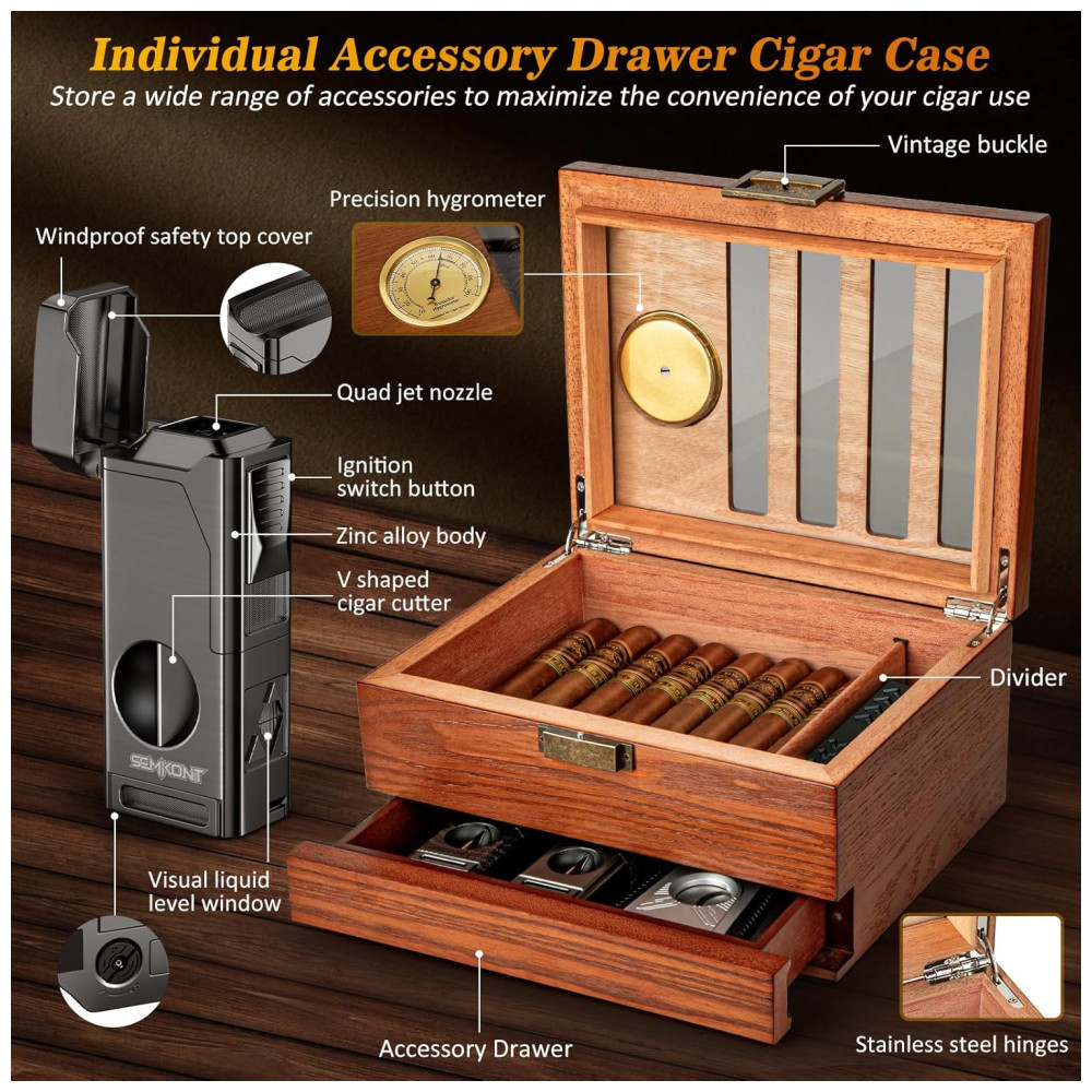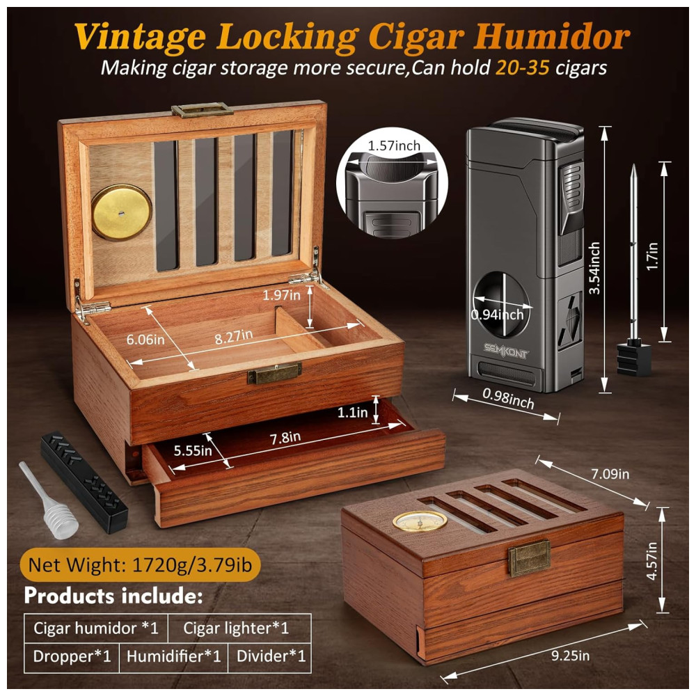 Umidor de Charutos SEMKONT – Gaveta com Fechadura Retrô em Cedro Tampo de Vidro com Higrômetro Embutido com Umidificador Isqueiro e Conta-Gotas – 30cm