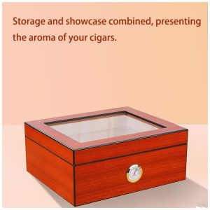 Umidor de Charutos SEMKONT – Gaveta com Fechadura Retrô em Cedro Tampo de Vidro com Higrômetro Embutido com Umidificador Isqueiro e Conta-Gotas – 30cm