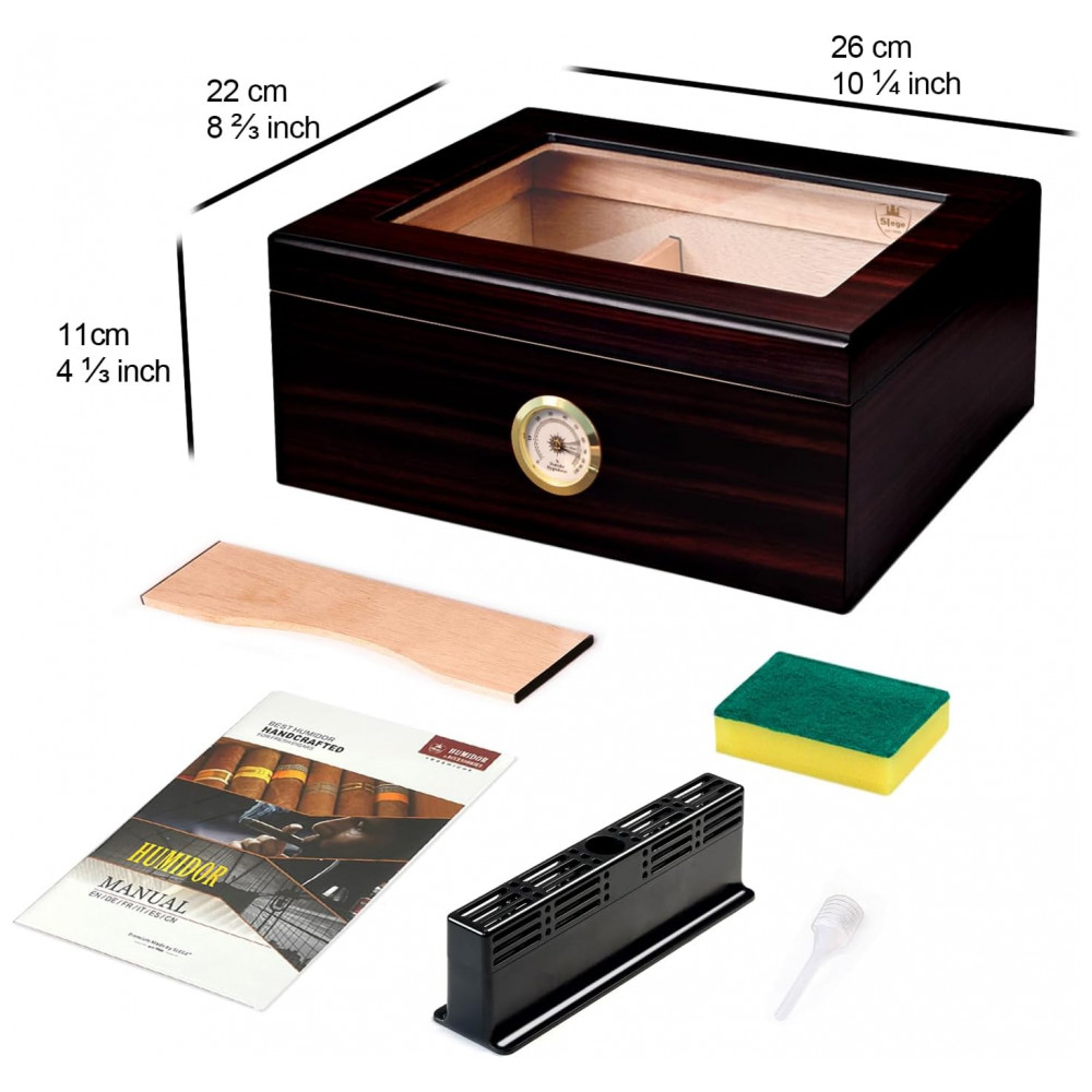 Mantenha seus charutos sempre frescos e protegidos com a nossa caixa umidor de charutos com tampa de vidro! Interior em madeira de Cedro Espanhol e divisória preservam o sabor e aroma ricos. Sua construção selada mantém os charutos mais frescos por mais tempo. O higrômetro frontal permite que você verifique os níveis de umidade a qualquer momento. Umidificador 3 em 1 atualizado feito de plástico ABS com contas embutidas. Uma carga pode durar de 5 a 6 semanas, criando o nível ideal de umidade para seus charutos. Precisa de um presente para alegrar o dia de alguém? Nossa caixa umidor de charutos é o presente perfeito de aniversário, aniversário, Natal ou Dia de Ação de Graças para qualquer apreciador de charutos. Com acabamento em ébano artesanal, dobradiças douradas brilhantes e design simples e bonito, este umidor de charutos personalizado em Cedro Espanhol certamente impressionará seus convidados. Durável e resistente, com vidro temperado resistente a marcas ou quebras acidentais, e base de veludo antiderrapante.