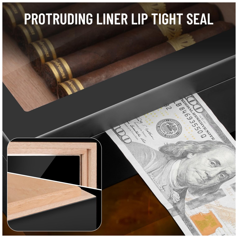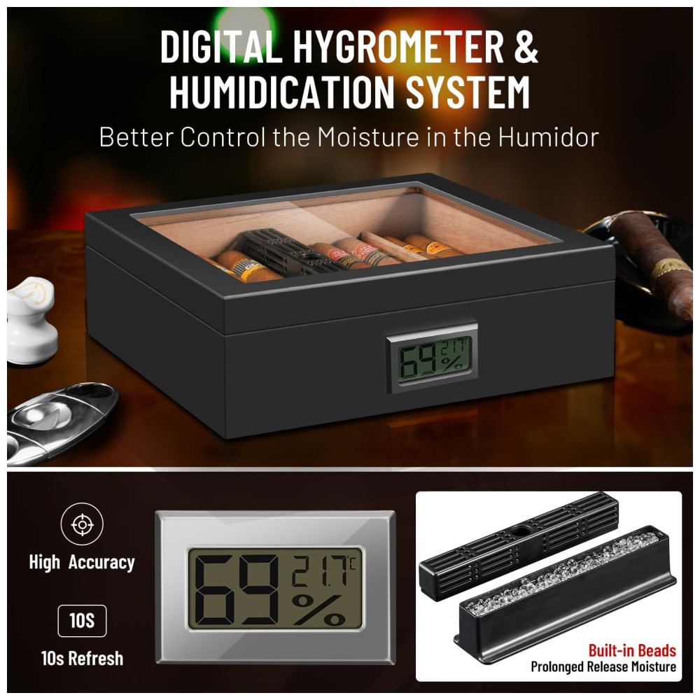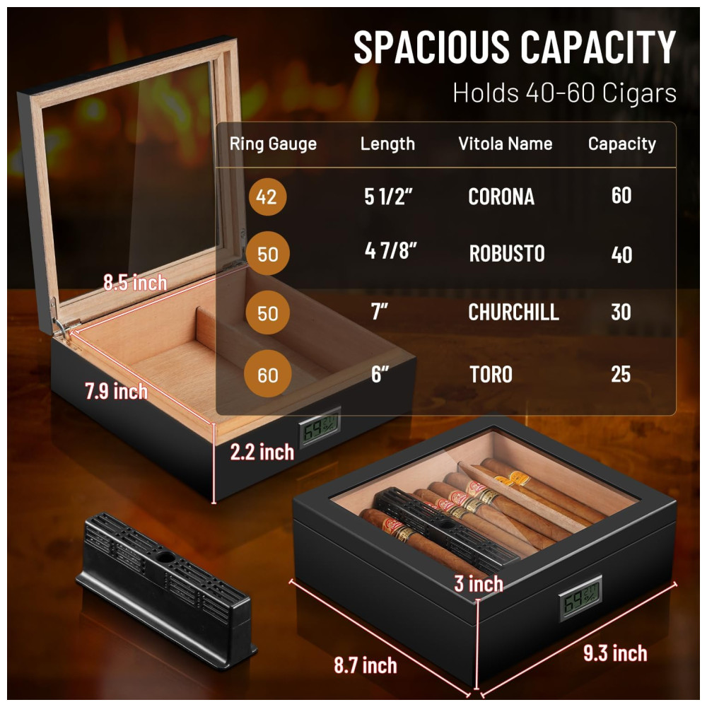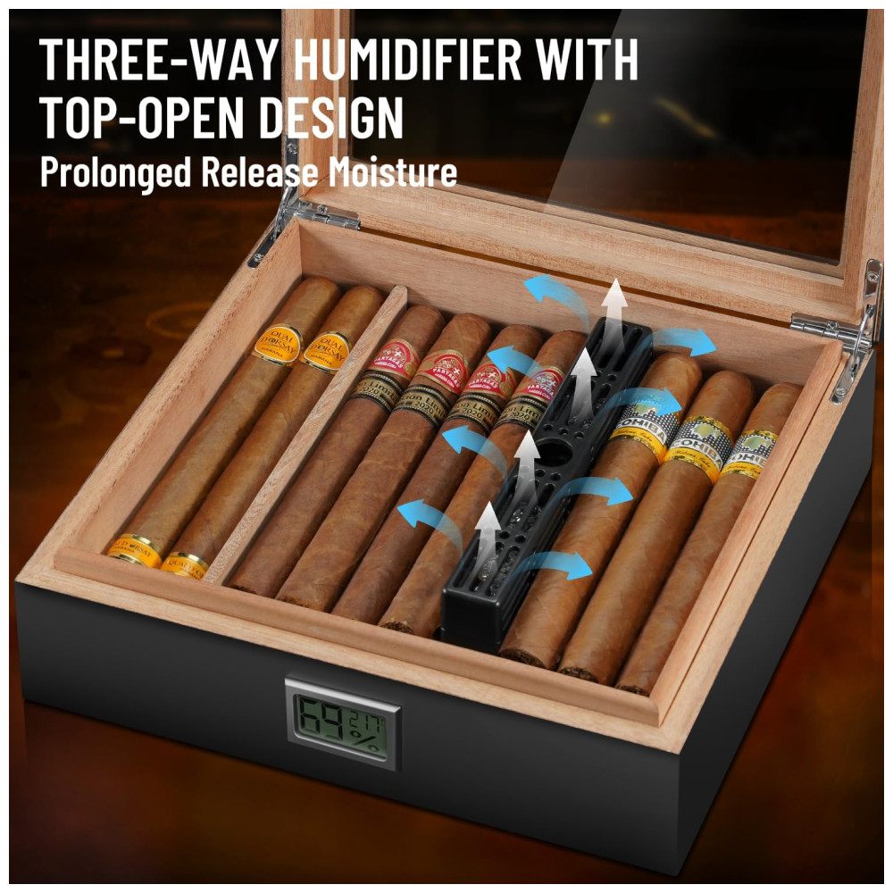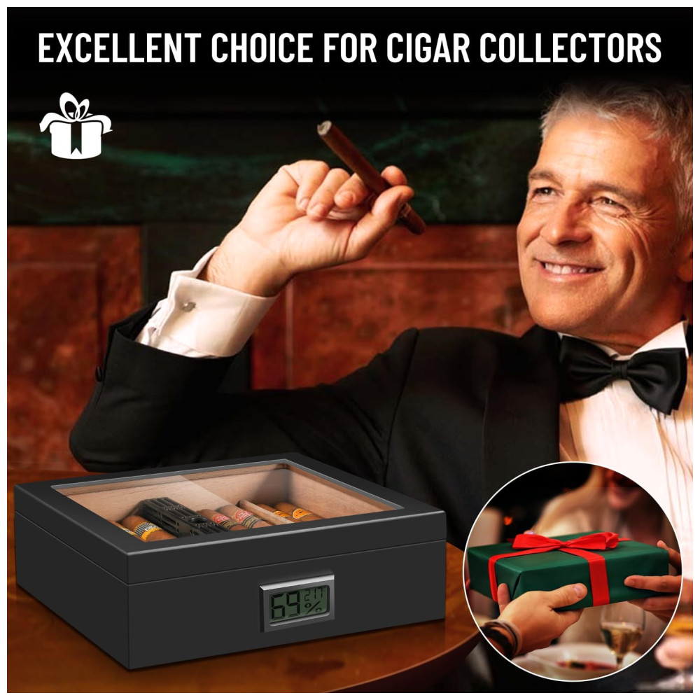 Desfrute de um interior de cedro genuíno que, devido ao seu aroma natural e capacidades de regulação de umidade, mantém o sabor, aroma e qualidade dos seus charutos por longos períodos. Esta umidora está devidamente selada, garantindo que a umidade interna seja totalmente bloqueada, criando um ambiente estável para o envelhecimento. O umidificador de gel personalizado com estrutura ranhurada proporciona múltiplas direções de fluxo de umidade. Basta adicionar água destilada ao gel, que liberará umidade lentamente ao longo do tempo. Além disso, pode ser usado como divisor, mantendo sua coleção organizada. O higrômetro digital preciso, com sensor aprimorado, garante medidas exatas atualizadas a cada 10 segundos, fornecendo informações precisas sobre o ambiente interno da umidora. Armazena até 60 charutos de diferentes tamanhos, apresentando um acabamento estético moderno preto que combina com qualquer estilo, além de vir em uma embalagem para presente. Sem dúvida, um presente maravilhoso para qualquer amante de charutos.