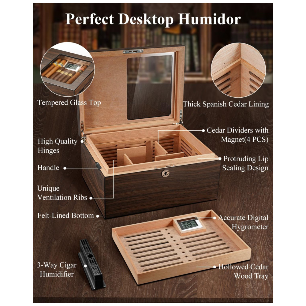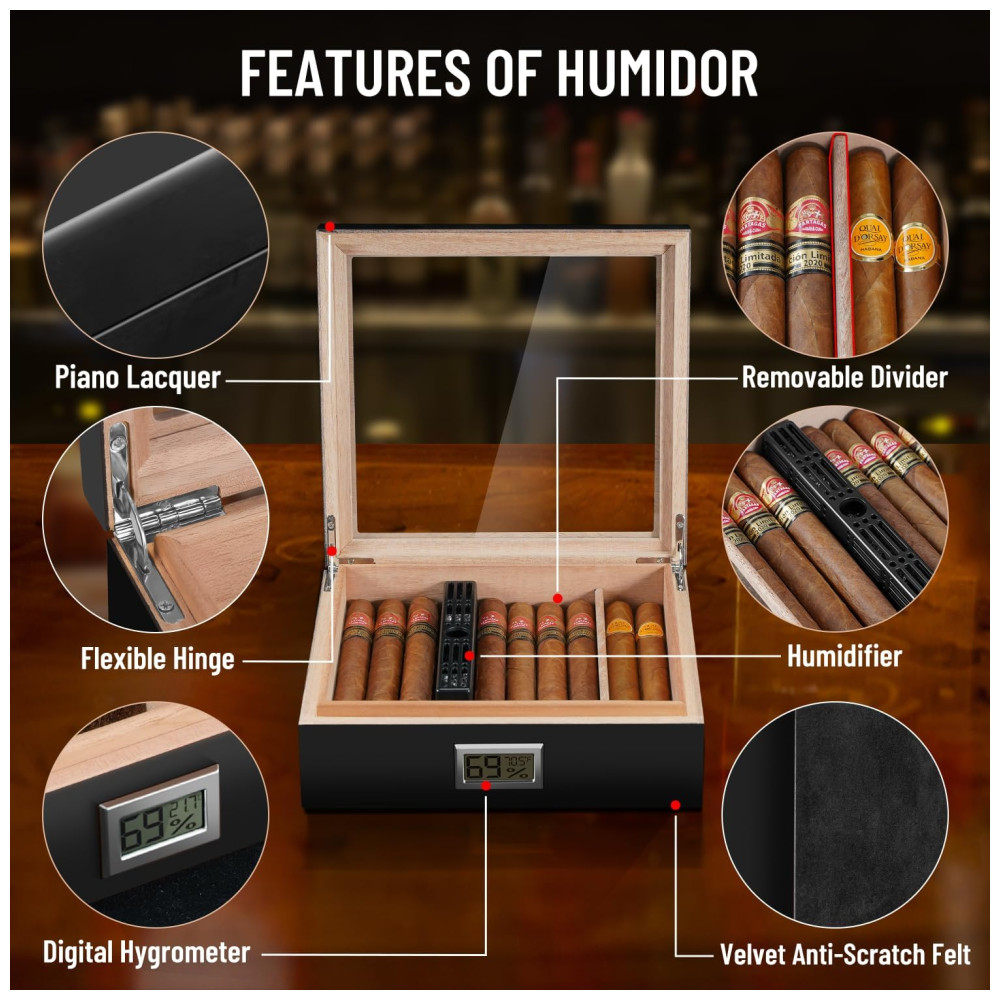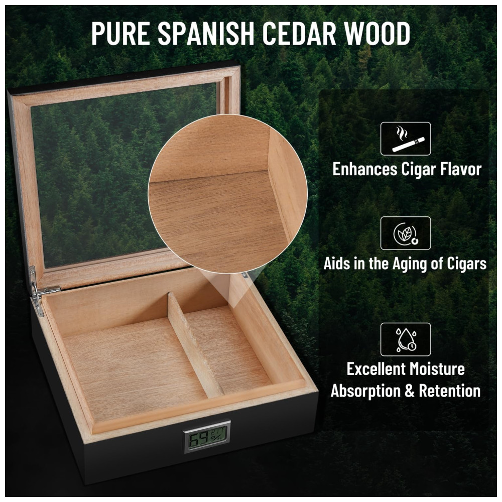 Umidor de Charutos Teplat Artesanal em Cedro Higrômetro Digital Divisor Removível Acabamento Preto Tampa de 120mm.