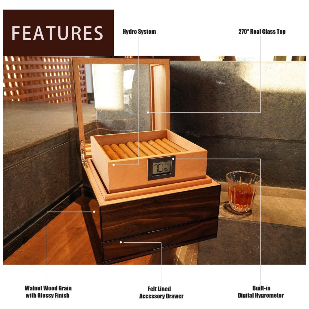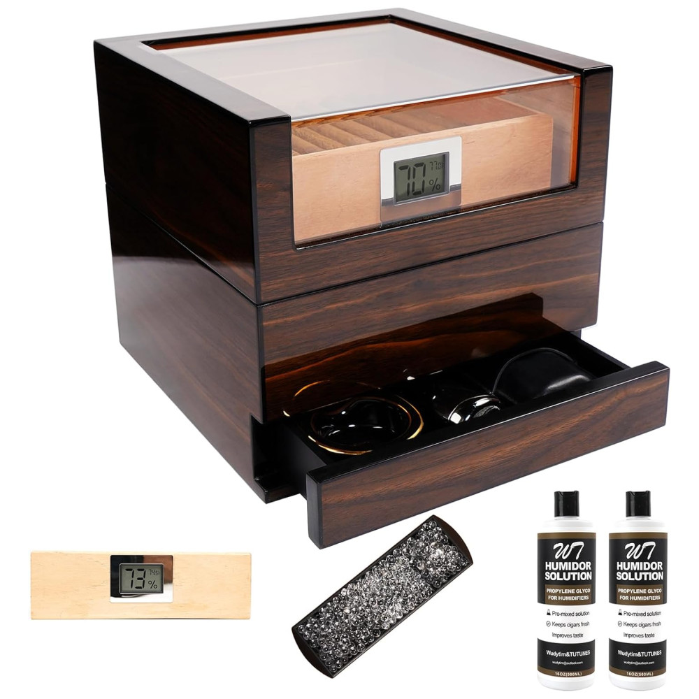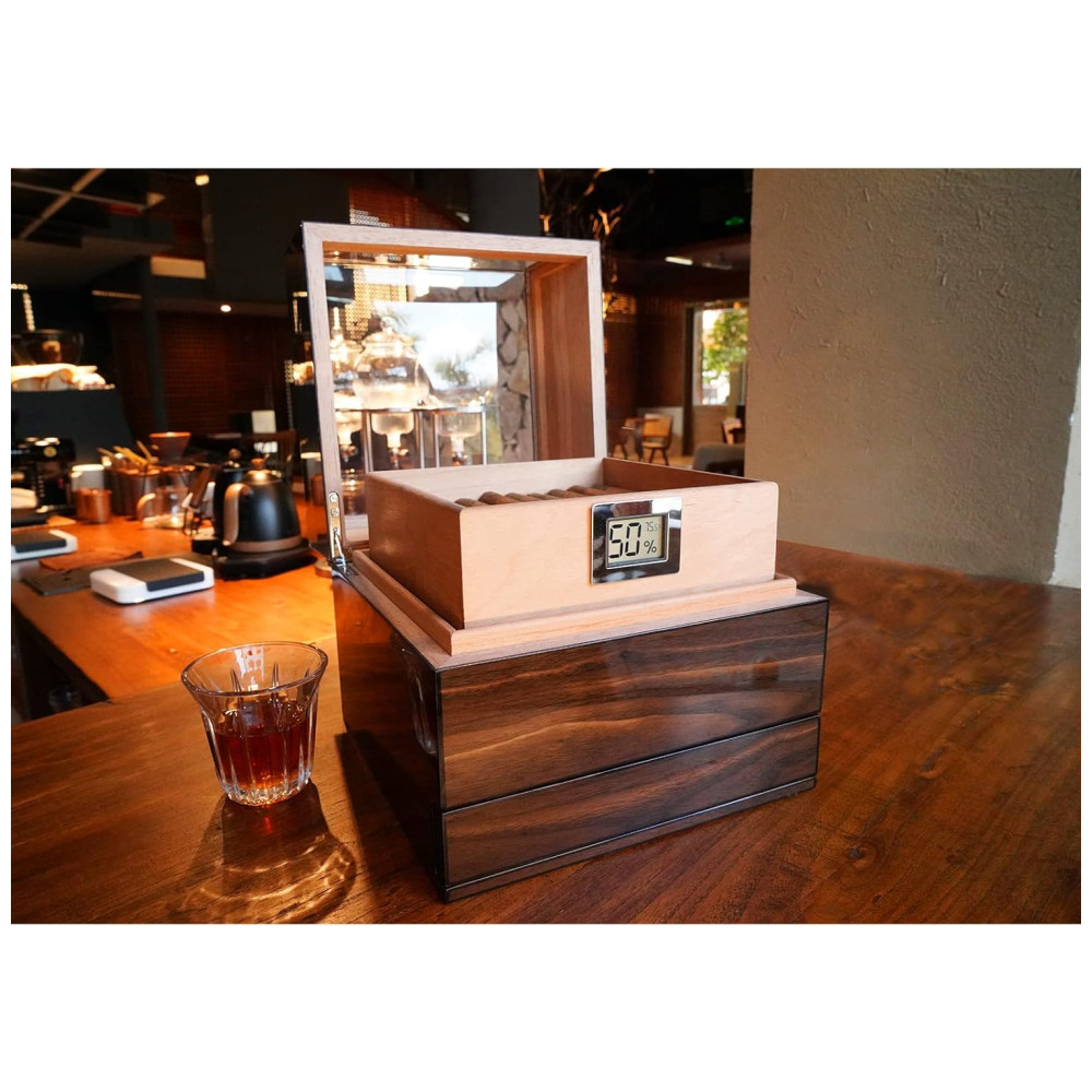 O umidor Cigar Box da TUTUNES é feito à mão com madeira de cedro espanhol natural, realçando o sabor natural dos charutos, prolongando sua vida útil e mantendo-os saudáveis. Com um verniz de madeira natural no exterior, cada humidor é único. Com capacidade para até 100 charutos, este humidor possui um design cientificamente aprimorado, incluindo um higrômetro digital embutido, bandeja de expansão e tampa inovadora que permite uma visão de 270 graus do interior. Armazene acessórios no amplo compartimento deslizante inferior forrado de feltro. Um presente ideal para apreciadores de charutos.