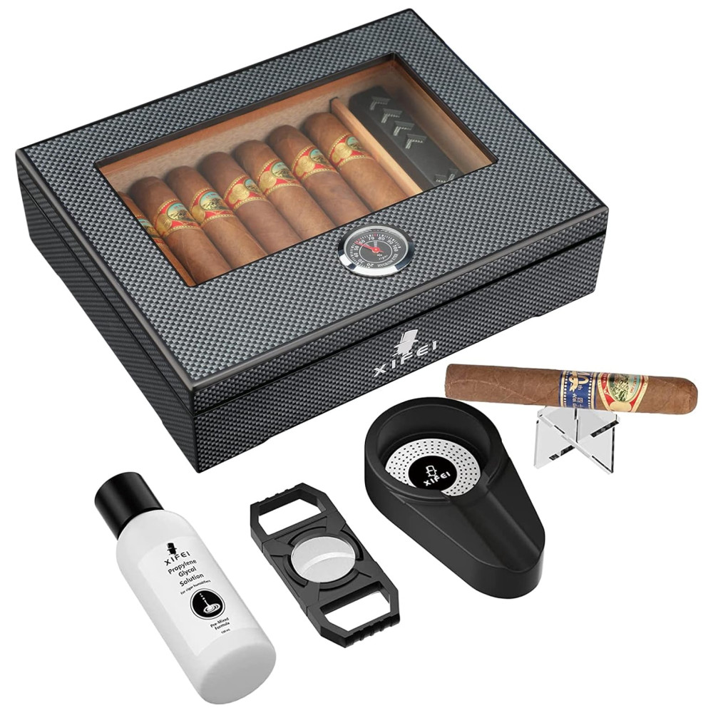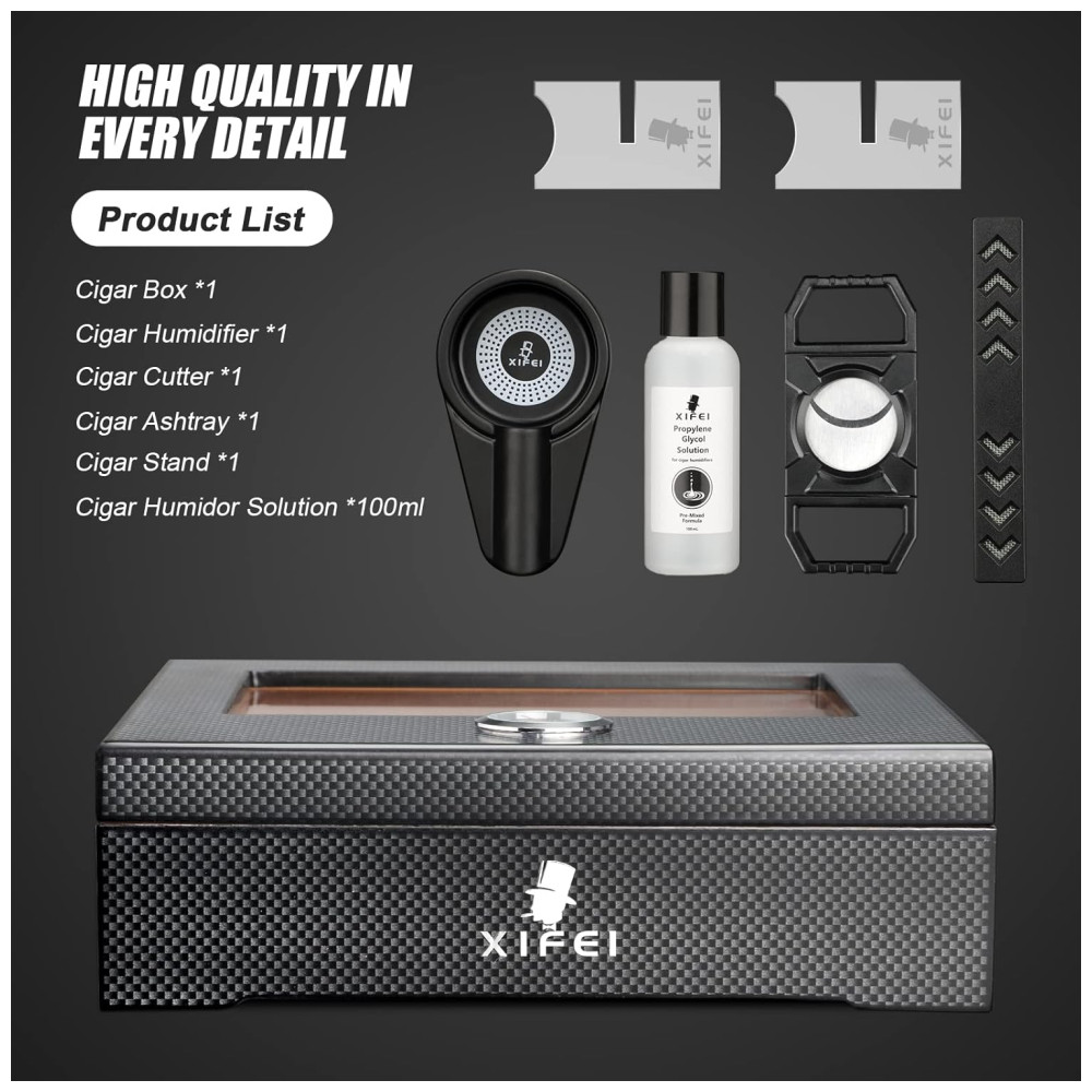 Umidor de Charutos XIFEI com Fibra de Carbono Visor de Vidro e Acessórios Premium – Capacidade para 25-60 Charutos Garantindo Umidade e Estilo