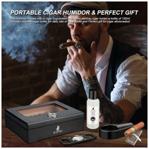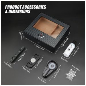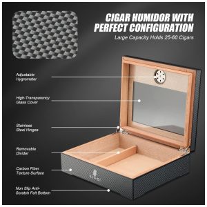 Umidor de Charutos XIFEI com Fibra de Carbono Visor de Vidro e Acessórios Premium – Capacidade para 25-60 Charutos Garantindo Umidade e Estilo