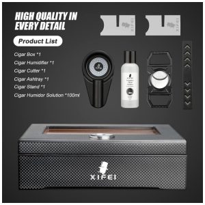 O umidor de charutos XIFEI com design em fibra de carbono apresenta um acabamento em pintura brilhante e detalhes requintados. Seu interior é revestido com madeira de cedro espanhol, ideal para resistir à umidade e pressão dos charutos. Com uma janela de vidro no topo, você pode observar seus charutos a qualquer momento. Com capacidade para 25-60 charutos, a umidificação ajustável permite monitorar e manter a umidade ideal. Além disso, inclui solução umidificadora, cortador de charutos, suporte de acrílico e cinzeiro dedicado. Perfeito para presentear e decorar, é ideal para amantes de charutos.