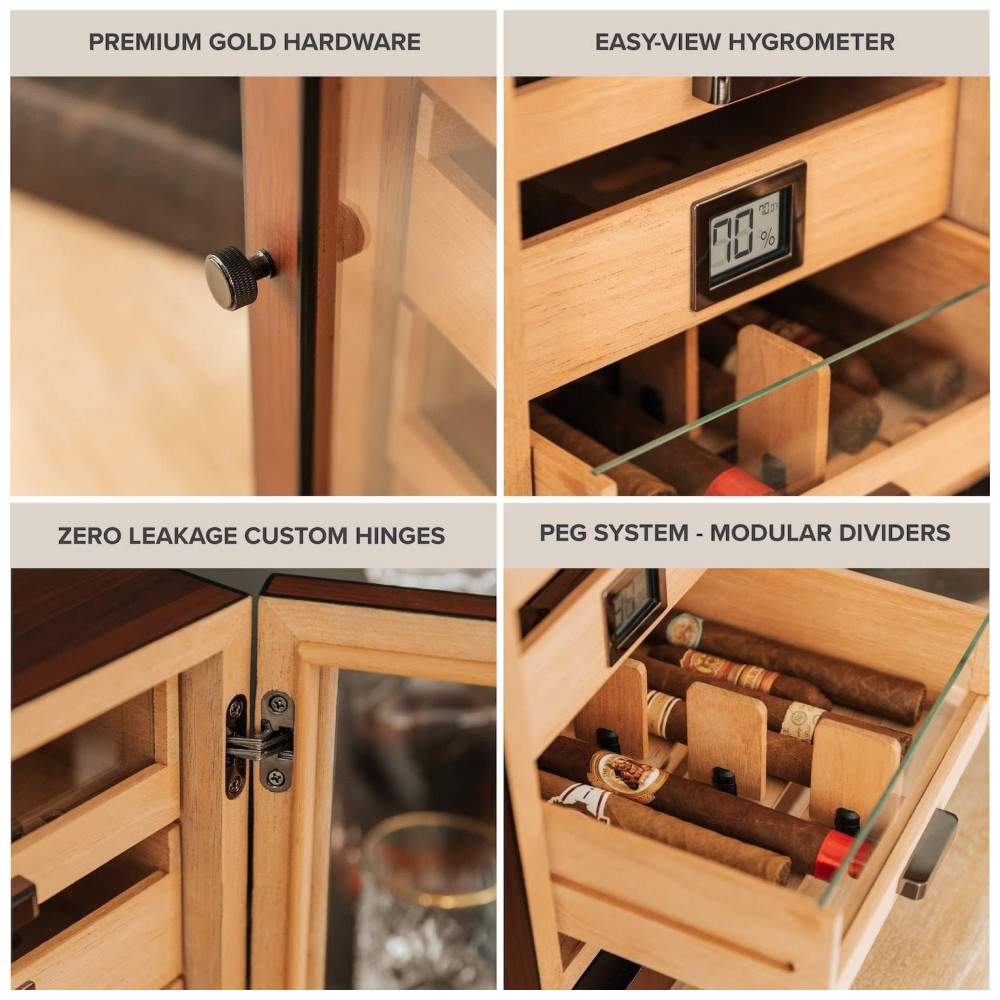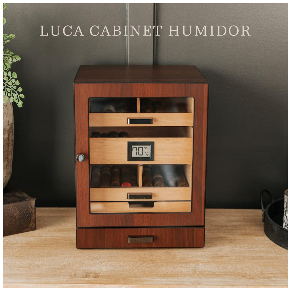 A capacidade deste armário umidor é impressionante, podendo armazenar de 80 a 100 charutos em três gavetas totalmente removíveis com frente de vidro temperado real. Cada gaveta apresenta nosso sistema exclusivo PEG, permitindo que você organize e armazene seus charutos da maneira que desejar. Além disso, o Luca inclui uma gaveta estendida para o Hydro Tray, facilitando o acesso e evitando a necessidade de manusear charutos para reabastecer com solução umidificante. O sistema Hydro é a solução mais fácil para manter a umidade ideal no umidor. A porta magnética estilo armário possui uma vedação excepcional, com ímãs fortes que eliminam vazamentos de ar. Feita com cedro espanhol espesso, a parte traseira do armário auxilia na regulação da umidade interna, resultando em menos manutenção. Além disso, o exclusivo Luca possui uma gaveta de acessórios para guardar isqueiros, cortadores de charutos e outros itens essenciais. Com o Luca, seus charutos estarão sempre frescos e prontos para serem apreciados.