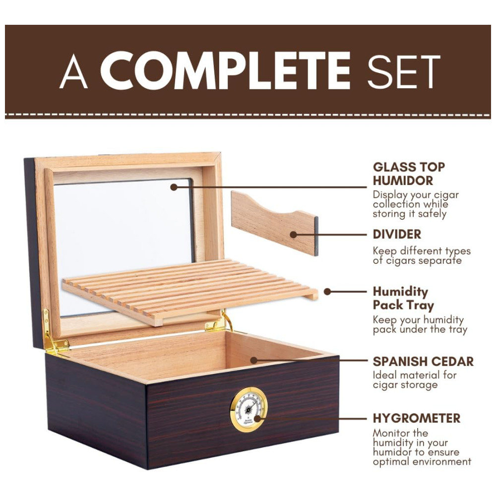 Componentes Incluídos: Humidor, Higrômetro, Umidificador, Divisor de Cedro Removível,