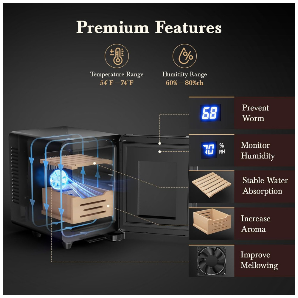Utilizando tecnologia de resfriamento por semicondutor, este umidor mantém a circulação do ar e proporciona um ambiente de resfriamento estável para um armazenamento mais inteligente. Funciona sem vibrações, sendo eficiente em termos de energia e ecológico. Faixa de temperatura: 12-23°C (Nota: Este produto apenas resfria abaixo da temperatura ambiente, não aquece).