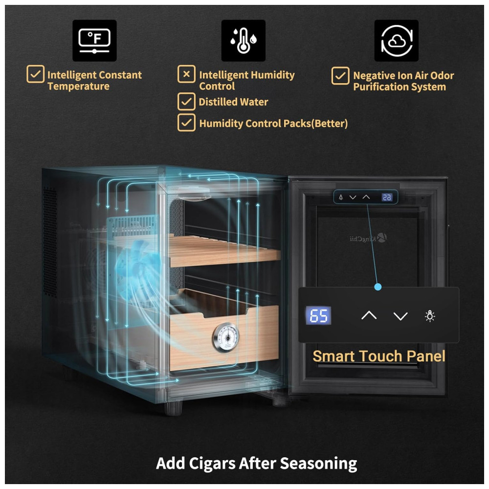 Desfrute de um ambiente de armazenamento ideal para seus charutos com o umidor Elétrico KingChii 16L. Equipado com tecnologia eletrônica de semicondutores, mantém uma faixa de temperatura constante entre 64 e 72 graus, emite baixo ruído de 40 dB e possui sistema de circulação de ar 360º livre de gelo. O gabinete possui prateleiras de cedro espanhol de alta qualidade que emitem um aroma natural, mantendo a umidade e evitando o ressecamento e mofo dos charutos. A porta de vidro temperado de dupla camada é isolada termicamente e de fácil limpeza. Além disso, o controle de toque eletrônico proporciona fácil operação. Este umidor é o presente perfeito para homens sofisticados, podendo ser colocado na sala de estar, escritório, quarto ou adega. Surpreenda seu pai ou amigos com um presente de aniversário, Dia dos Pais ou de Ano Novo.