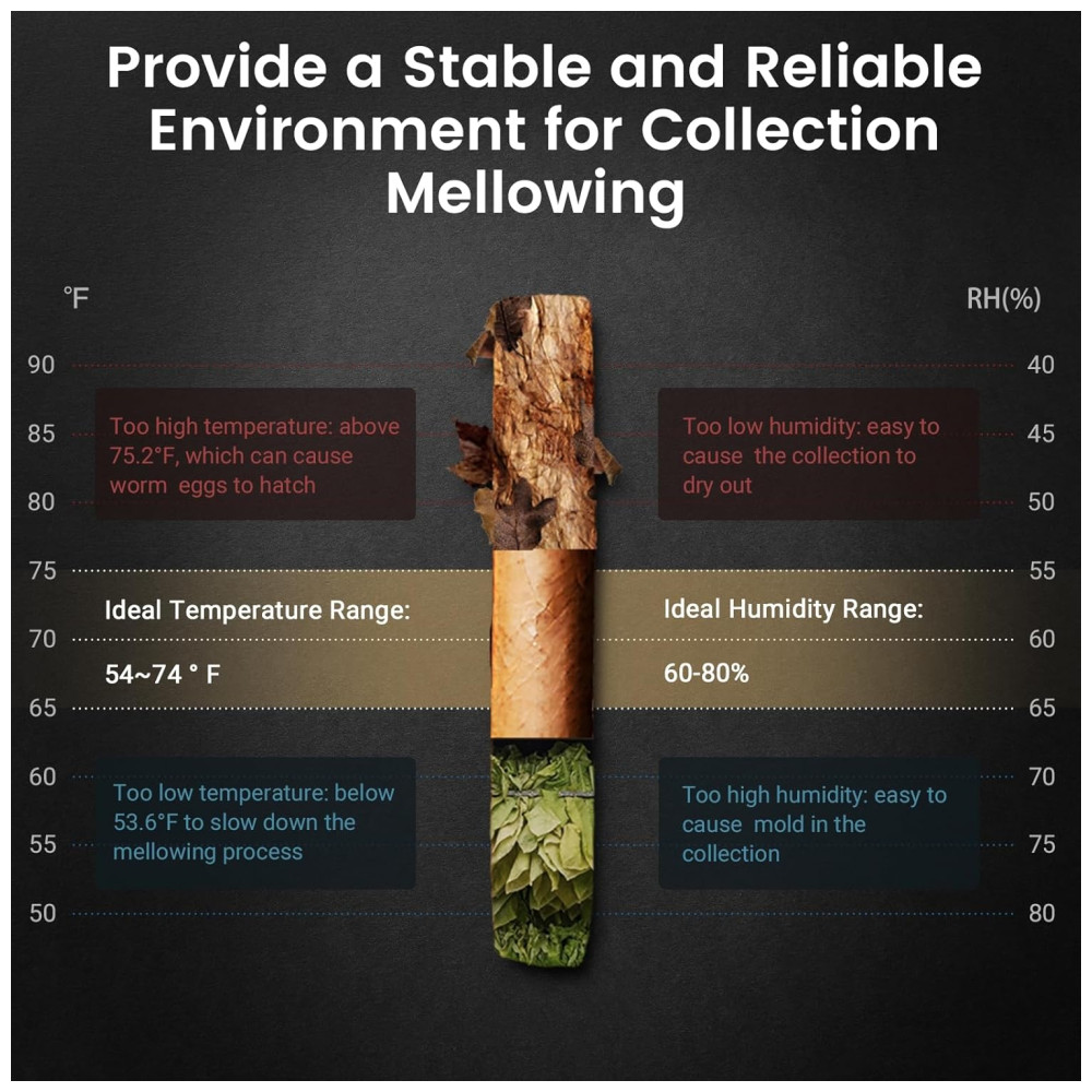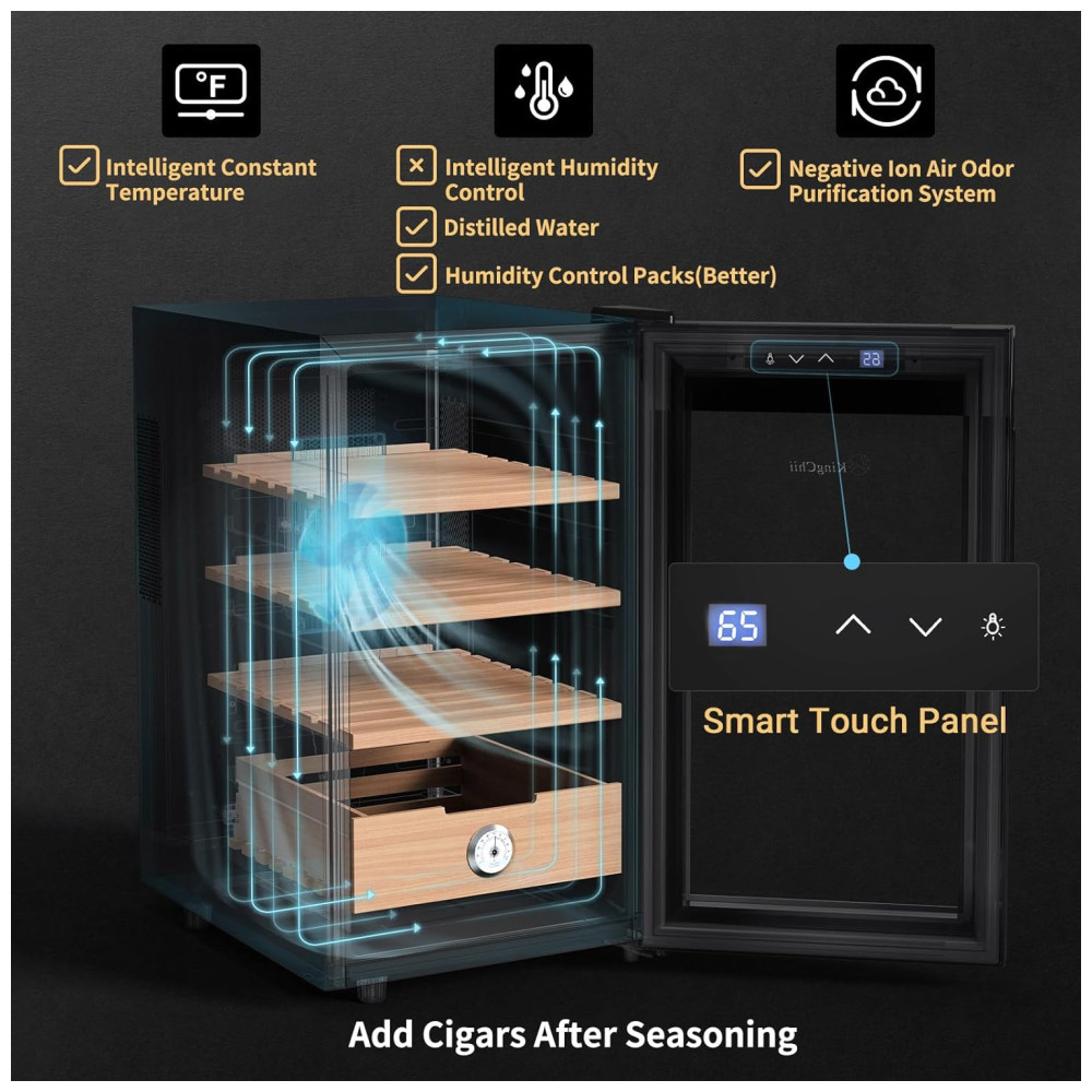 Aproveite o controle preciso de temperatura do Humidor KingChii, que utiliza tecnologia eletrônica de semicondutores para manter um ambiente estável e silencioso. Com circulação de ar de 360 graus, o armário garante a temperatura e umidade ideais para o armazenamento de charutos. O cedro espanhol de alta qualidade presente nas prateleiras emite um aroma natural que mantém a umidade, evita odores indesejados e previne o ressecamento e mofo dos charutos. Além disso, a porta de vidro temperado de alta resistência e painel touch screen oferecem um toque de elegância a este presente de luxo, ideal para qualquer ambiente.