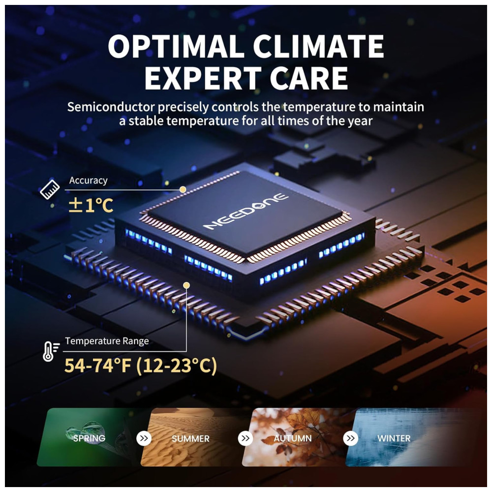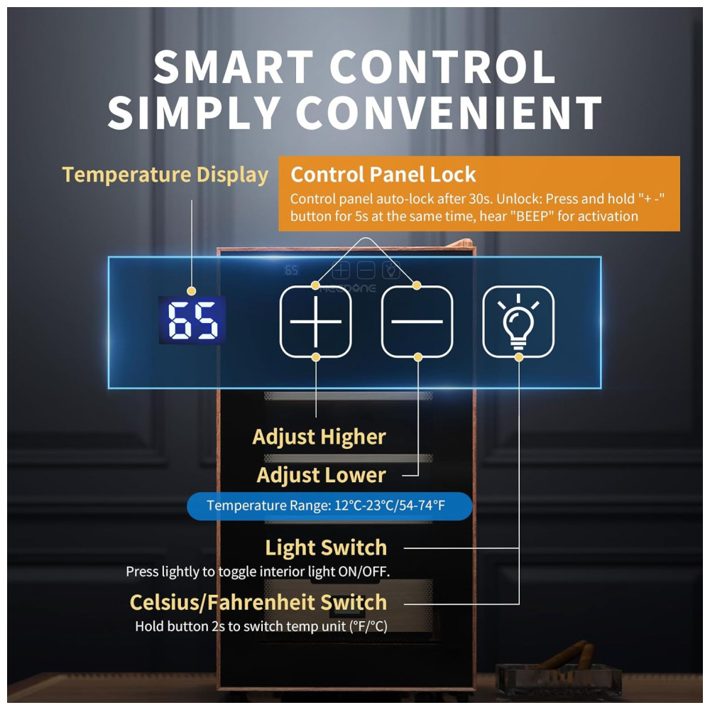 Funcionalidade para Todas as Estações: Com funções integradas de aquecimento e resfriamento, o umidor atende perfeitamente a todas as estações do ano. Faixa de controle de temperatura: 12°C a 23°C. A temperatura ambiente recomendada é de 5°C a 26°C. Alterne facilmente entre Celsius e Fahrenheit, alcançando rapidamente a temperatura ideal para o envelhecimento e maturação dos seus charutos.
