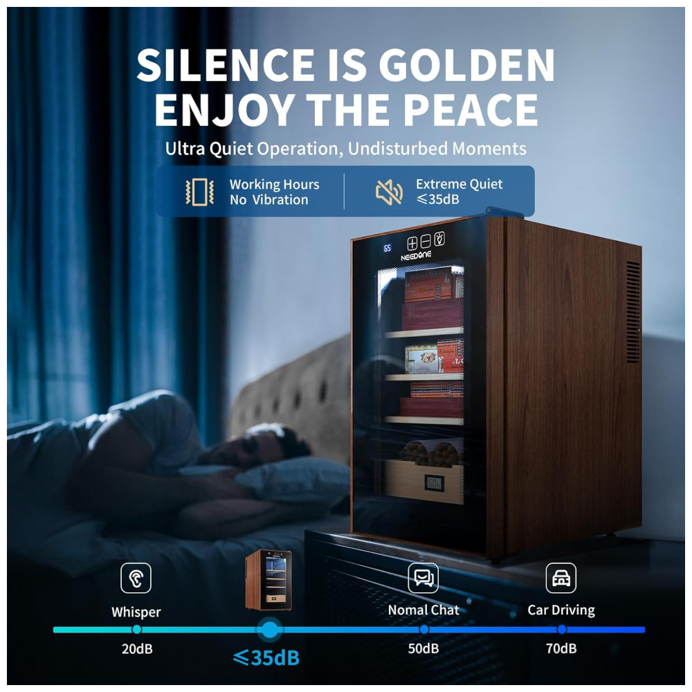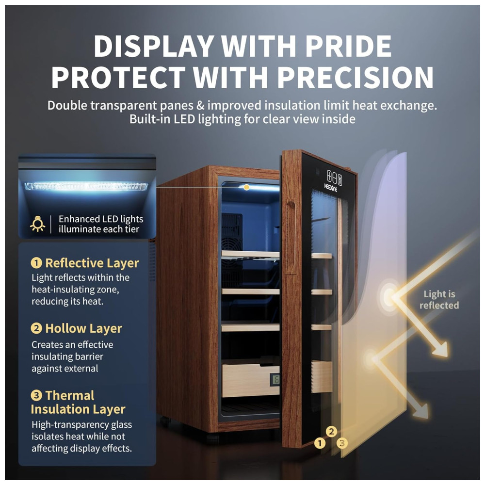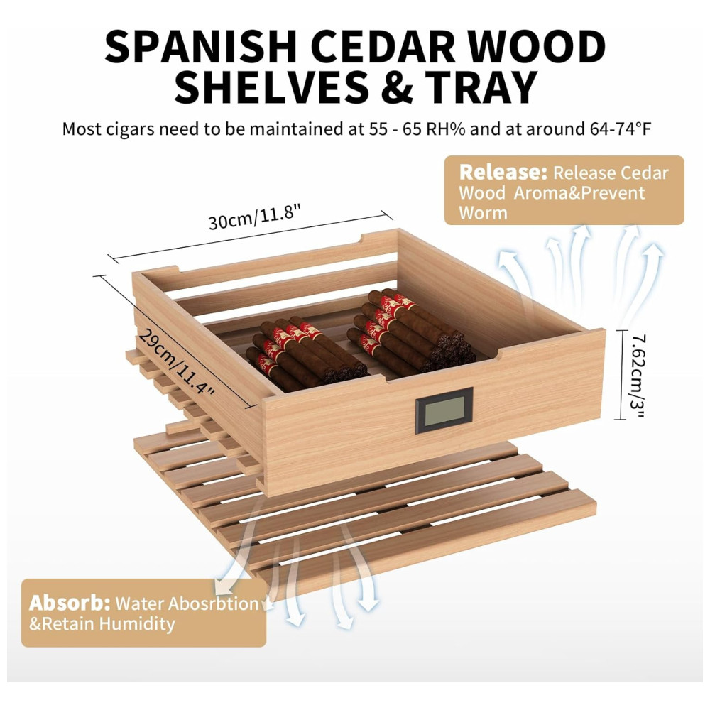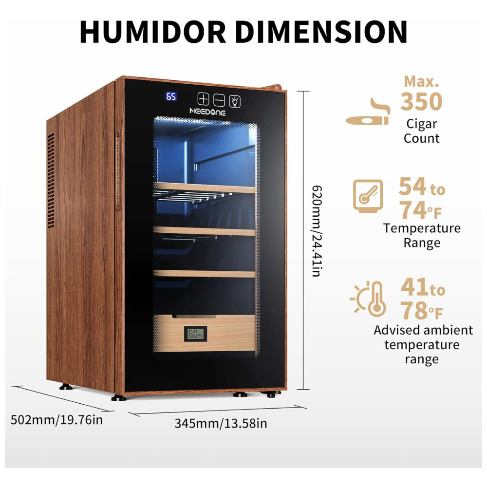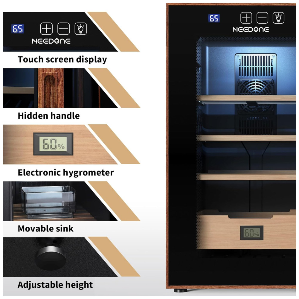 Umidor Elétrico NEEDONE 48L com Controle de Aquecimento e Resfriamento Capacidade para 350 charutos Prateleiras e Gaveta de Cedro Espanhol.