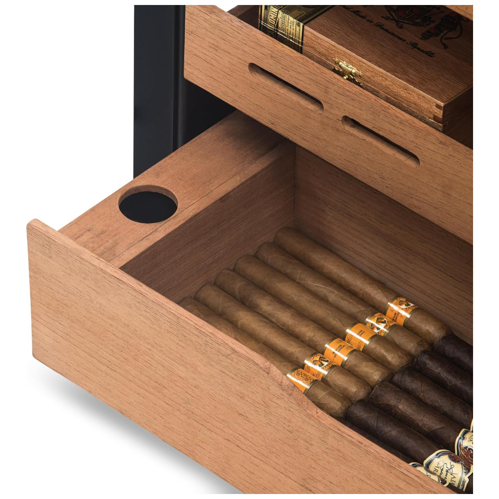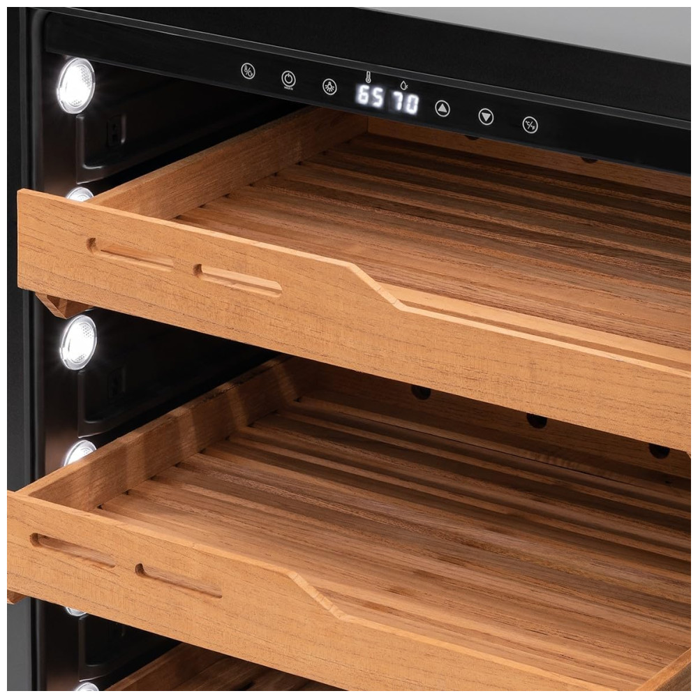 Iluminação LED nas Gavetas: Cada gaveta possui iluminação LED, facilitando a visualização dos charutos sem abrir a porta, preservando a temperatura e umidade interna.