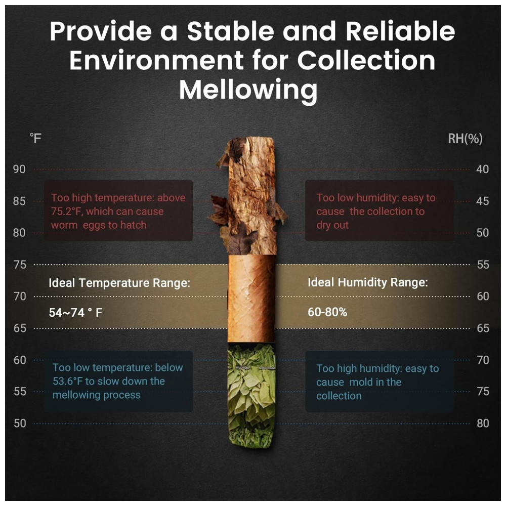 Dupla função de refrigeração e aquecimentoDiferente de outros gabinetes do , possui dupla função de refrigeração e aquecimento. O ambiente de zenamento é mais inteligente. Não há vibração quando o humidor está funcionando, economizando energia e protegendo o meio ambiente.