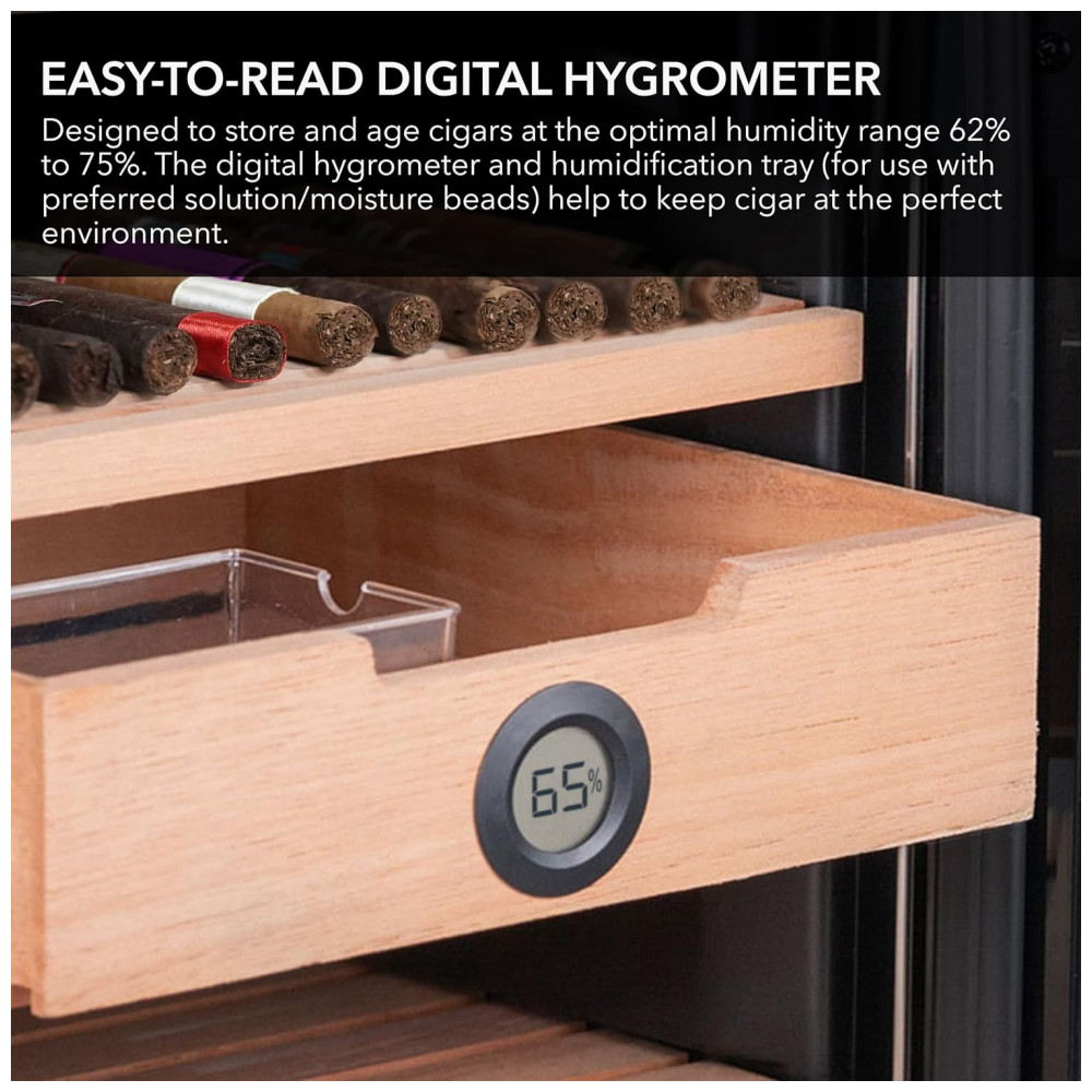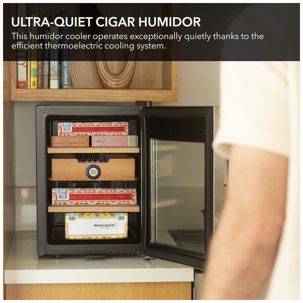 Medidas Capacidade de 34 litros Equipado para acomodar mais de 250 charutos Configuração independente e resfriamento termoelétrico sem vibração.