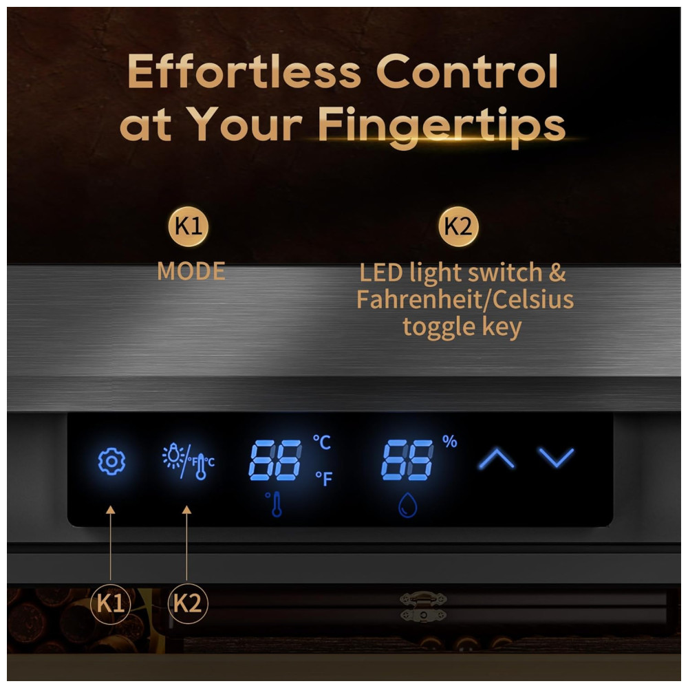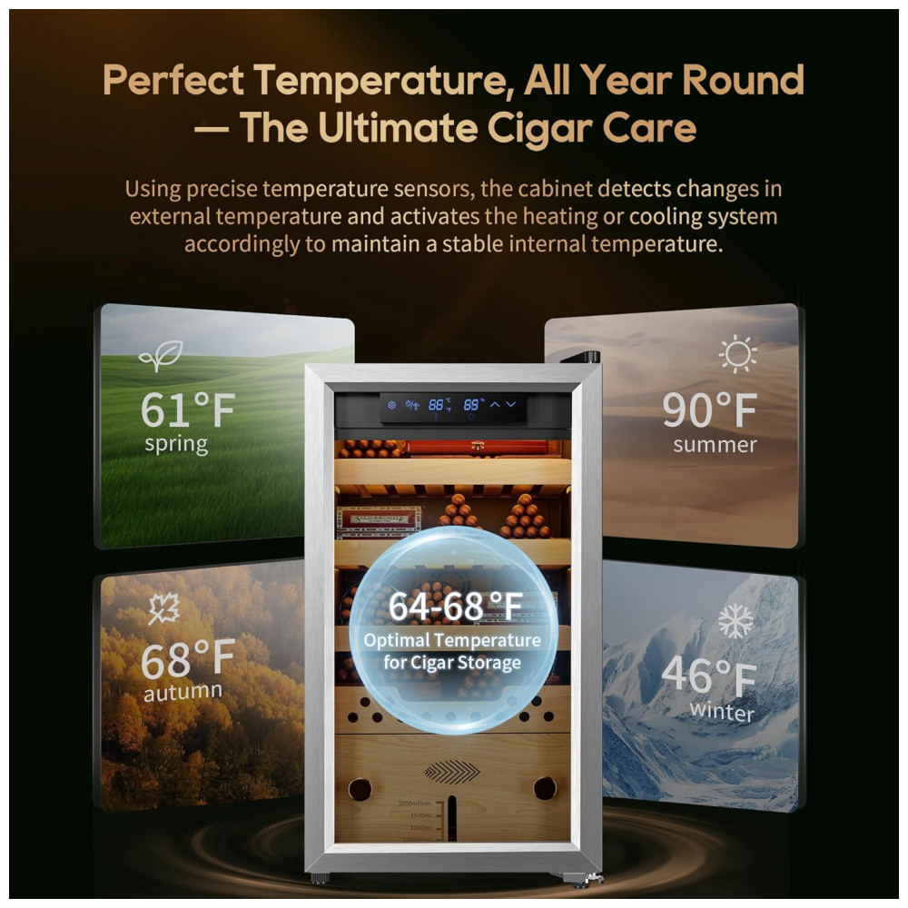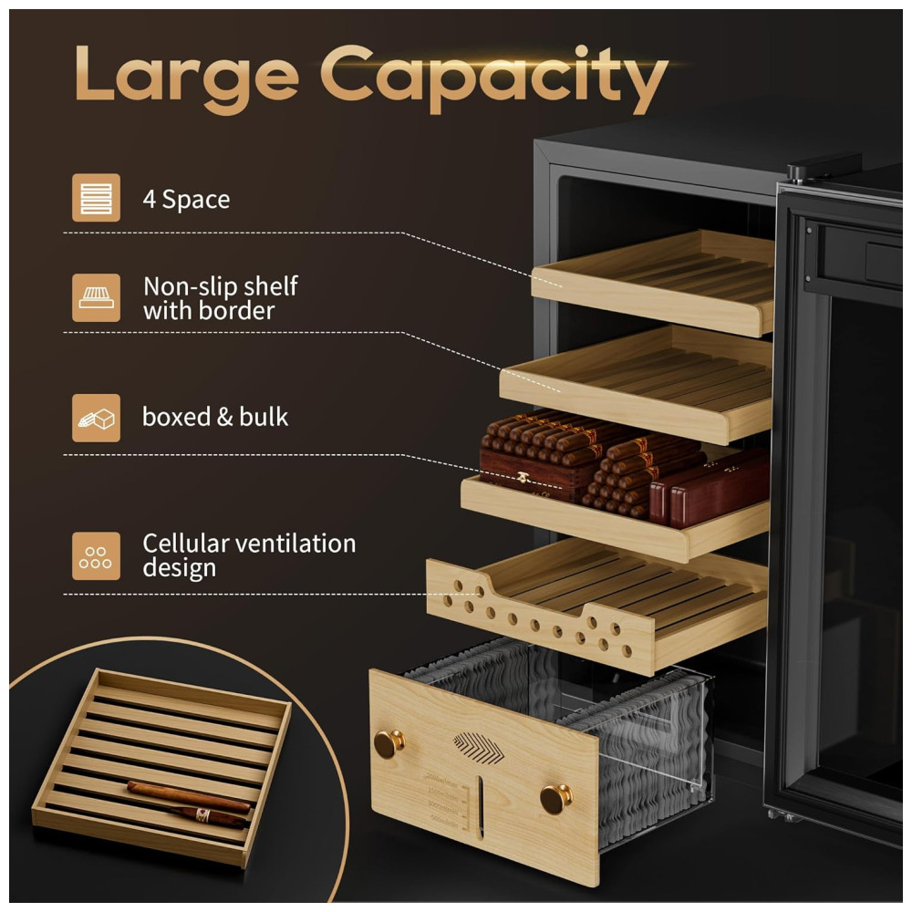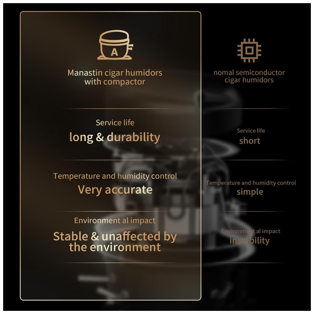 Tecnologia Avançada de Resfriamento por Compressor: Ao contrário dos modelos termelétricos tradicionais, este umidor de charutos conta com resfriamento por compressor de última geração, garantindo estabilidade superior de temperatura e desempenho ideal em diferentes condições ambientais. Oferece resfriamento mais confiável para controle constante de temperatura, perfeito para o armazenamento de charutos a longo prazo.