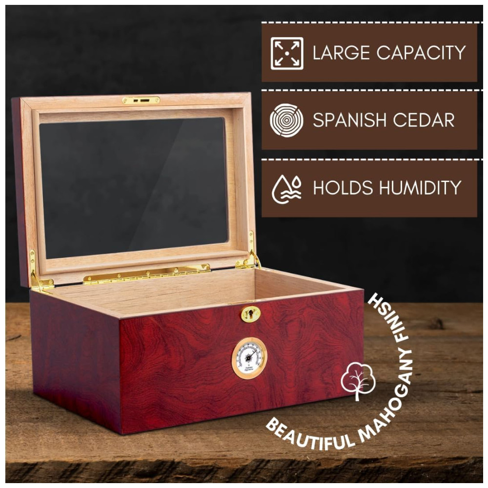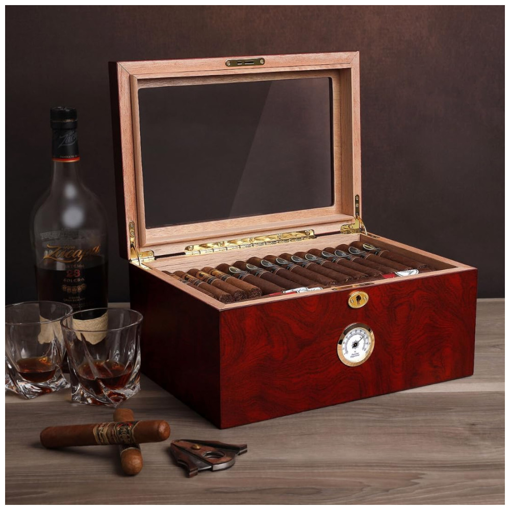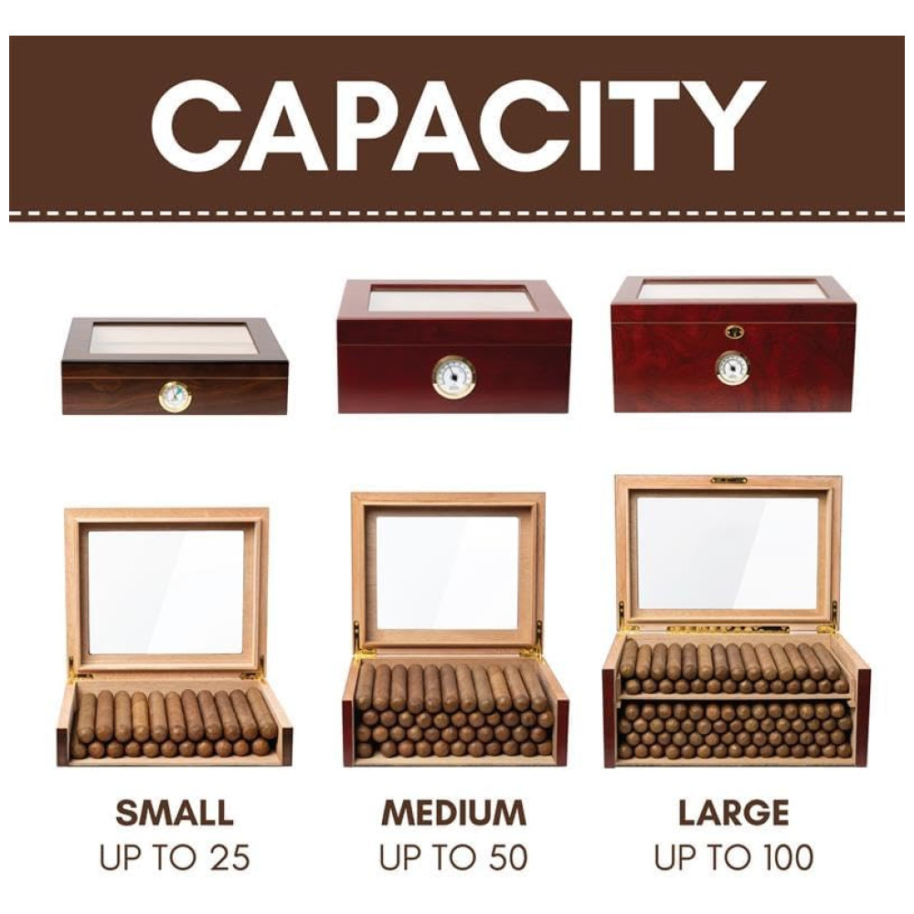 Umidor Mantello Cigars Large Glasstop para Charutos com Capacidade de até 100 Charutos Higrômetro e Bandeja de Cedro Removível
