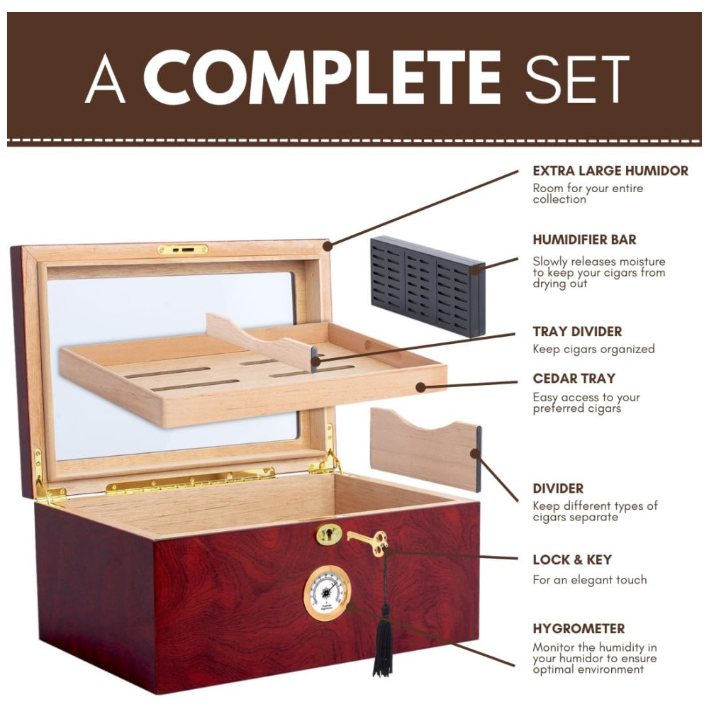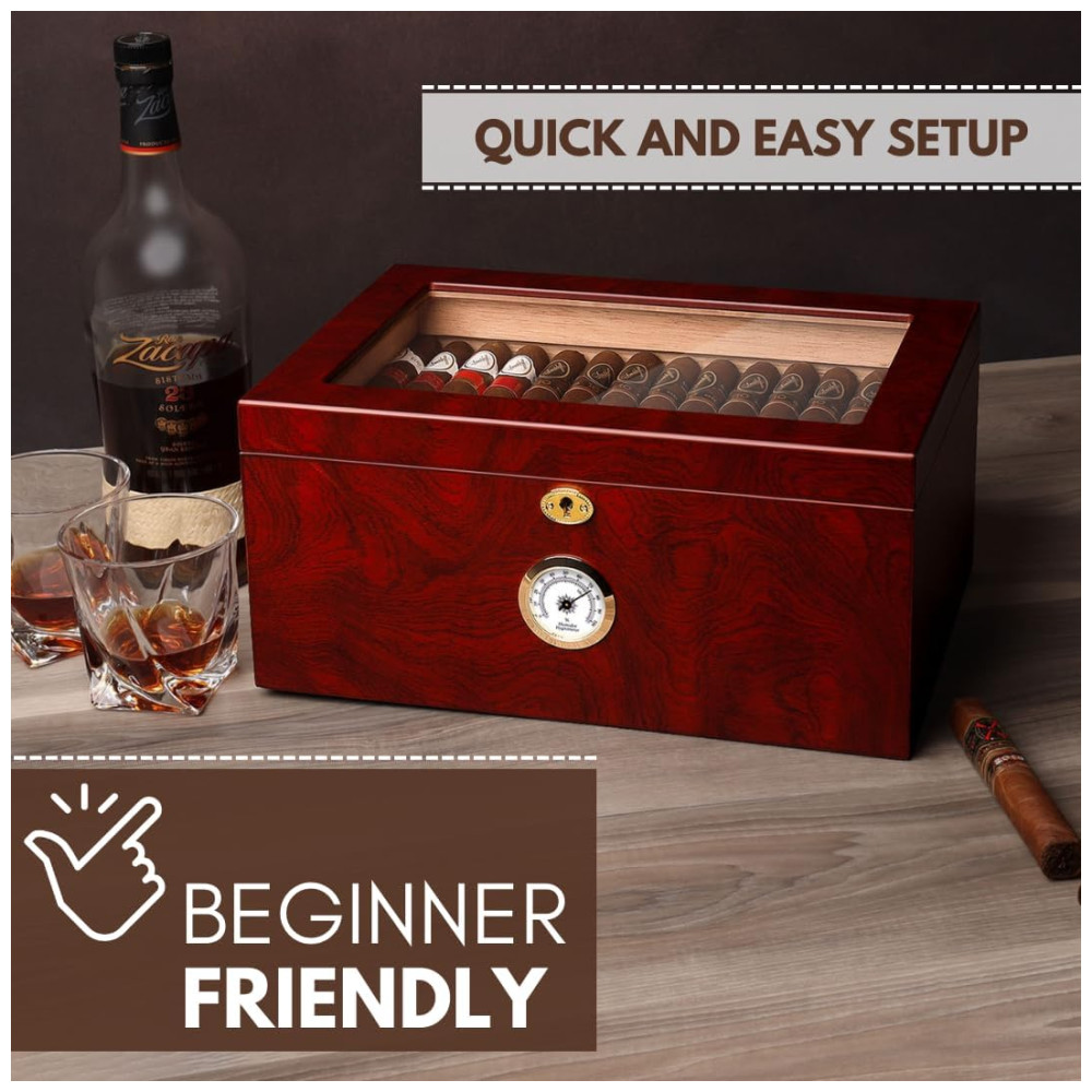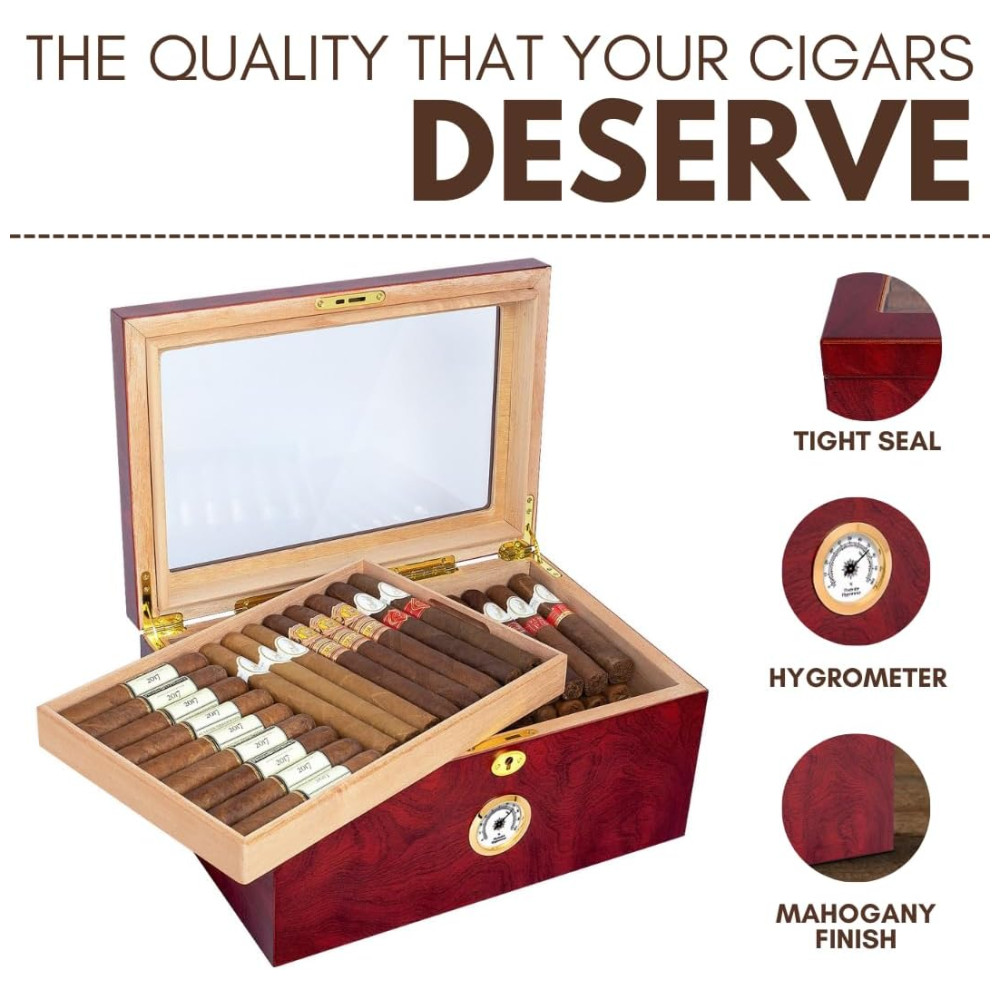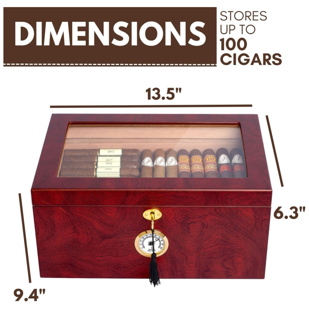 Umidor Mantello Cigars Large Glasstop para Charutos com Capacidade de até 100 Charutos Higrômetro e Bandeja de Cedro Removível