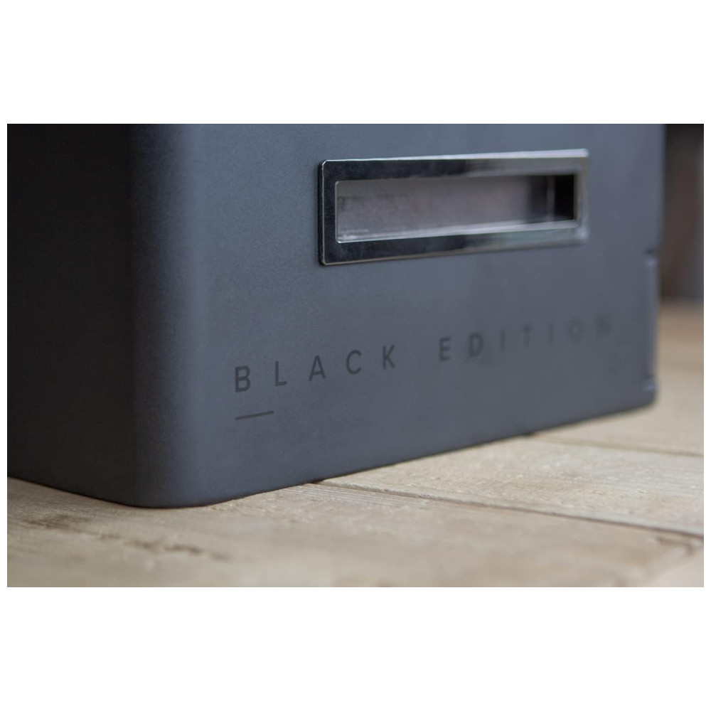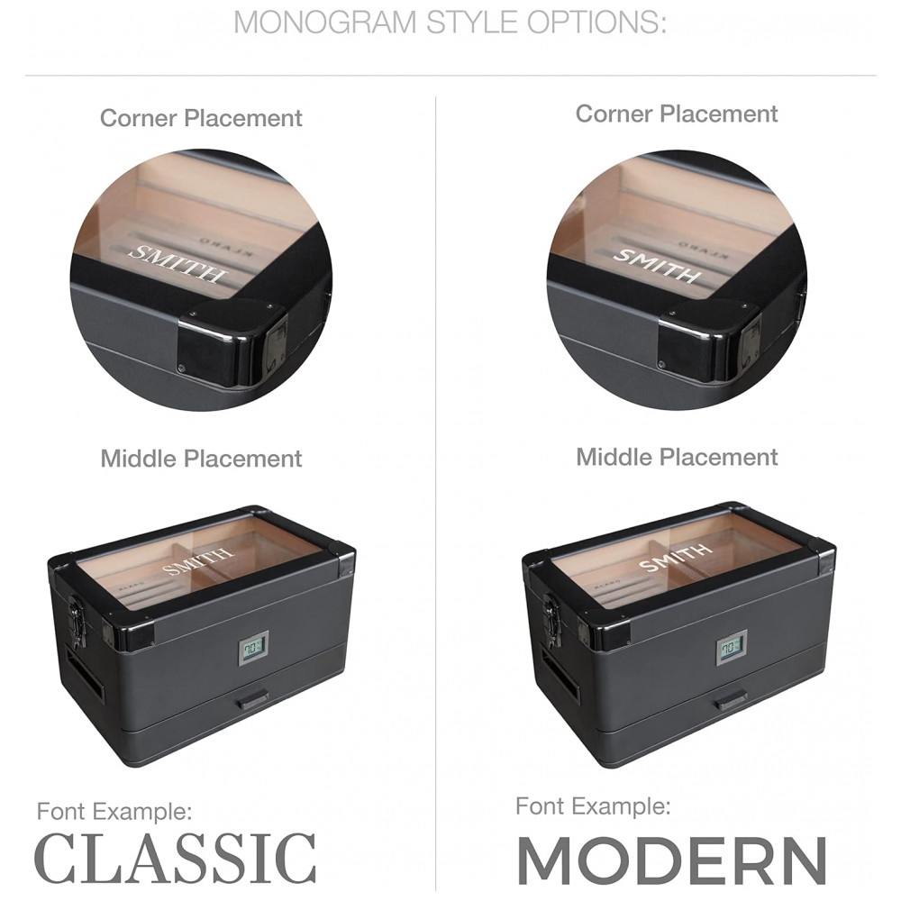 EDIÇÃO PRETA LIMITADA Este umidor de edição limitada foi inspirado em baús militares e é finalizado com um luxuoso revestimento preto fosco com estêncil preto polido. Este humidor sério é para o aficionado sério.