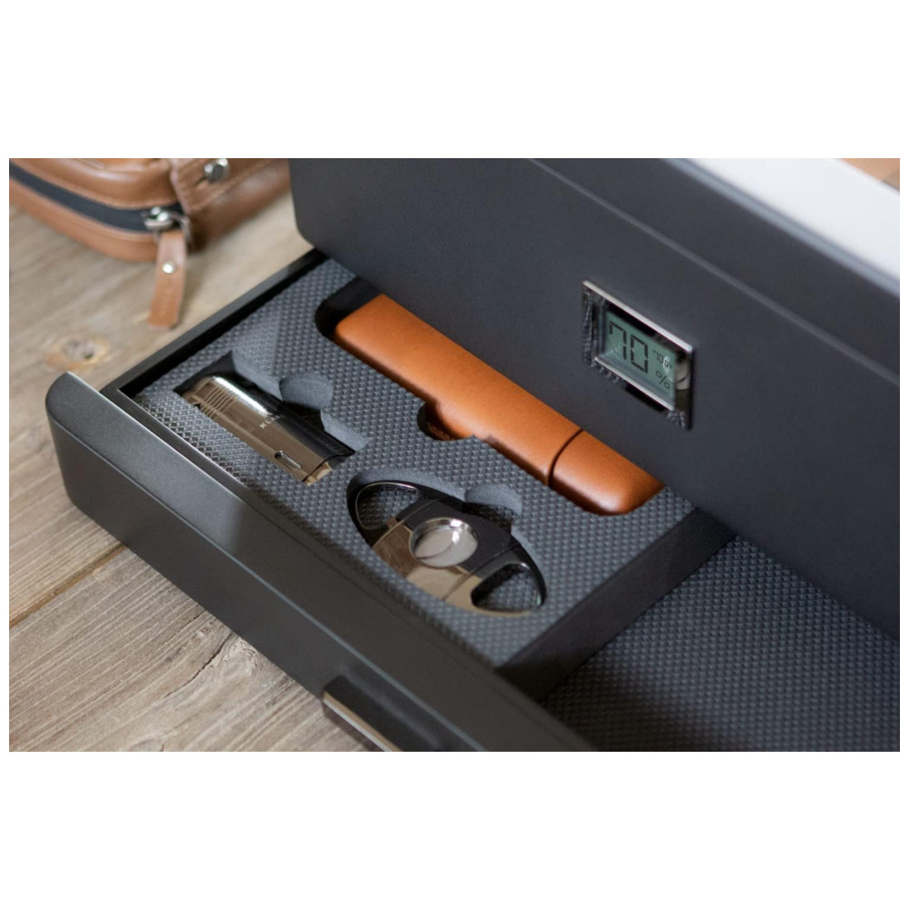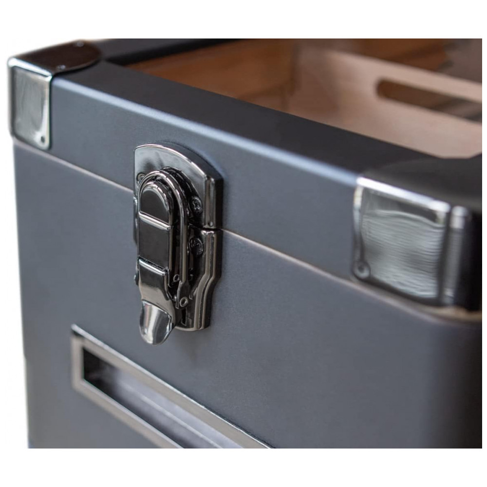 APROVADO AFICIONADO Construída em madeira grossa e embutidos de cedro espanhol este humidor é o negócio real. O exterior ostenta um acabamento preto fosco com componentes de metal polido personalizados, incluindo protetores de canto, travas laterais da tampa, alças e o higrômetro digital frontal. Também incluímos uma bandeja de zenamento removível que pode ser deslizada. Não é mais necessário remover a bandeja superior para alcançar os charutos que você deseja na parte inferior.