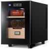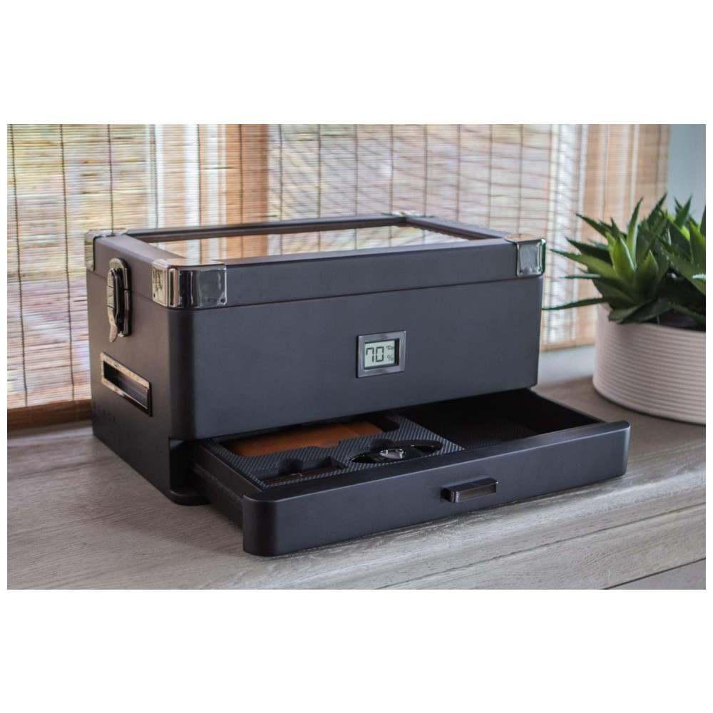 APROVADO AFICIONADO Construída em madeira grossa e embutidos de cedro espanhol este humidor é o negócio real. O exterior ostenta um acabamento preto fosco com componentes de metal polido personalizados, incluindo protetores de canto, travas laterais da tampa, alças e o higrômetro digital frontal. Também incluímos uma bandeja de zenamento removível que pode ser deslizada. Não é mais necessário remover a bandeja superior para alcançar os charutos que você deseja na parte inferior.