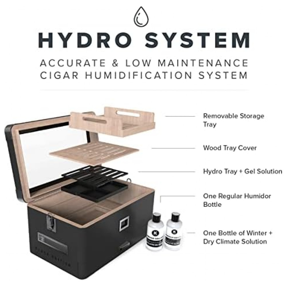 TEMPERO PERFEITO Contamos com o Hydro System, um sistema de umidificação de charutos de baixa manutenção. Esta solução com patente pendente torna o controle da umidade do umidificador entre 65 72 de umidade relativa uma tarefa simples. Ao recuar o sistema Hydro, maximizamos quantos charutos você pode zenar. Recomendamos adquirir a associação Klaro para obter um suprimento de um ano para manter seu humidor temperado