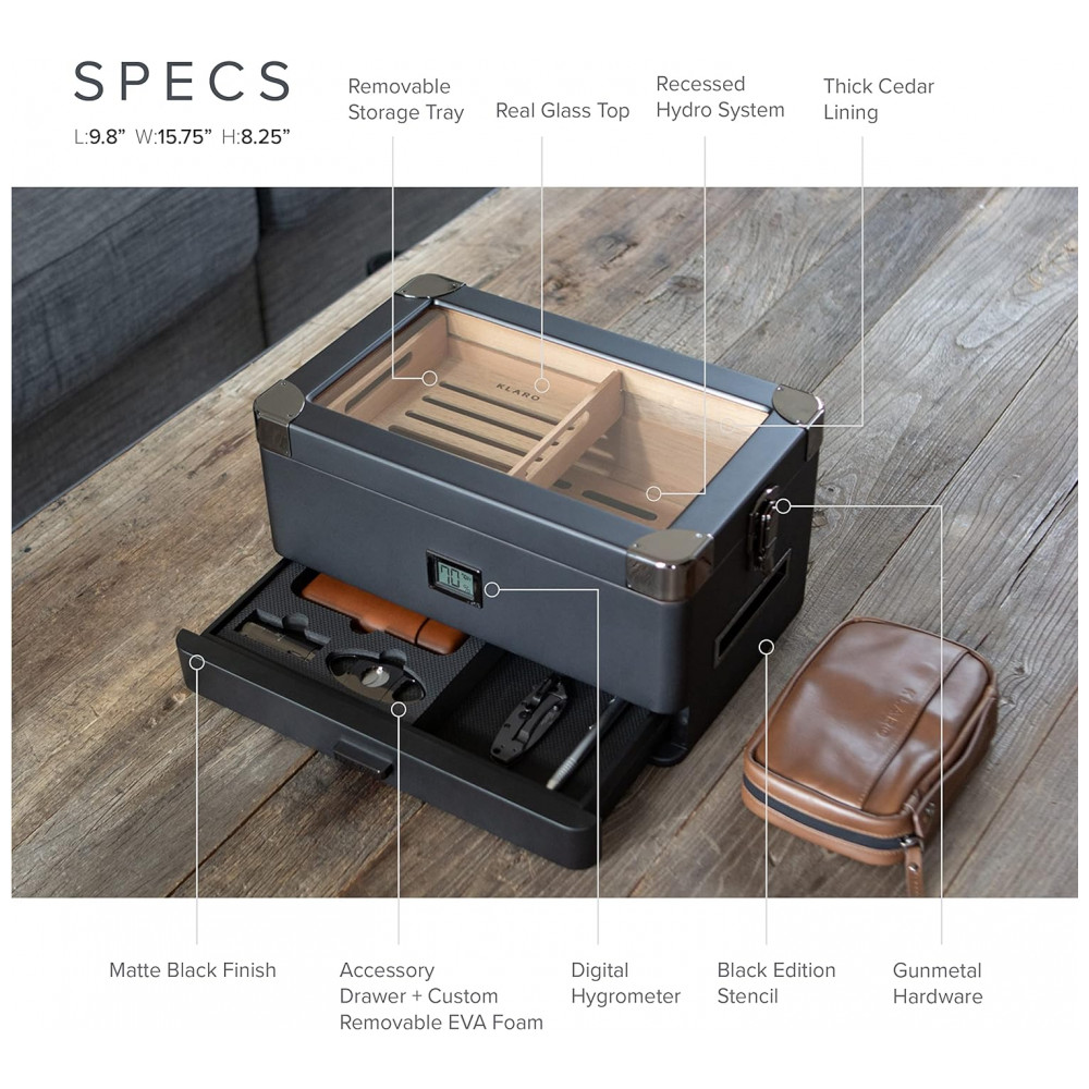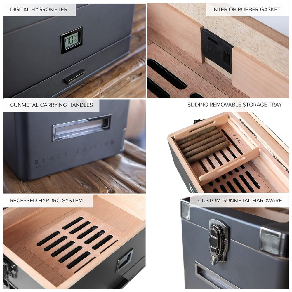 EDIÇÃO PRETA LIMITADA Este umidor de edição limitada foi inspirado em baús militares e é finalizado com um luxuoso revestimento preto fosco com estêncil preto polido. Este humidor sério é para o aficionado sério.