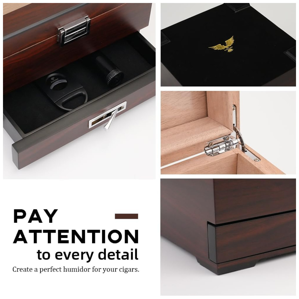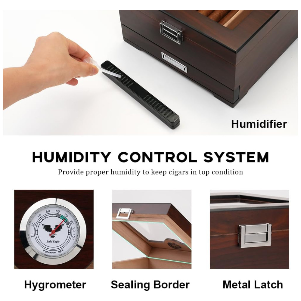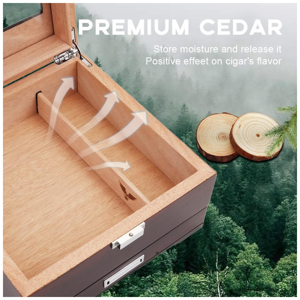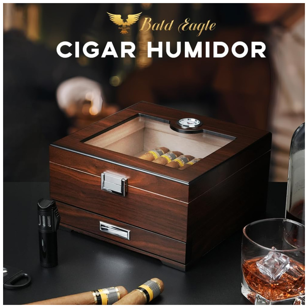 Umidor para Charutos Bald Eagle Feito à Mão em Cedro com Umidificador e Higrômetro Com Gaveta para Acessórios e Capacidade para 30-35 Charutos