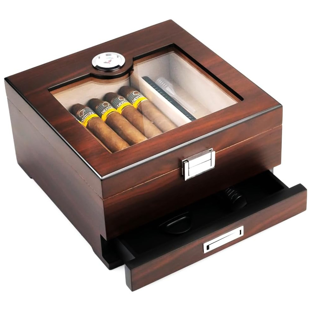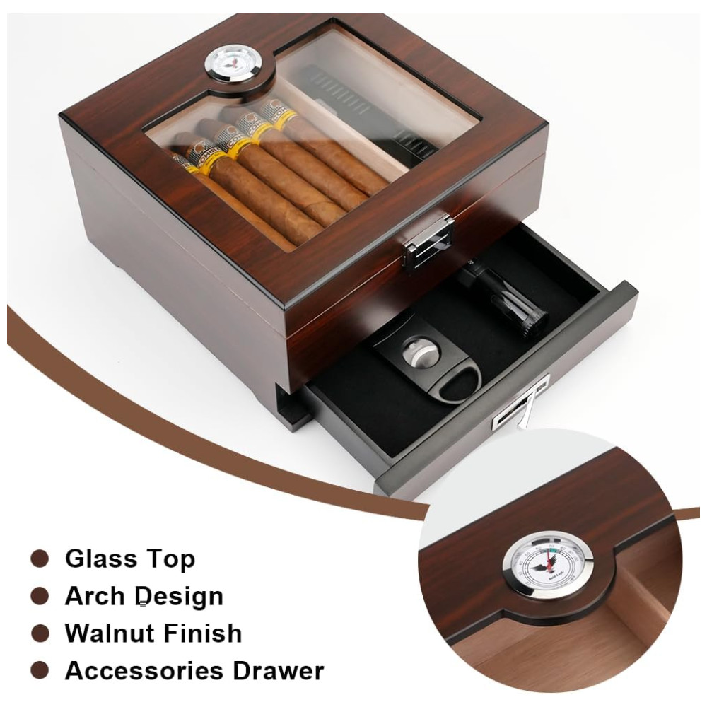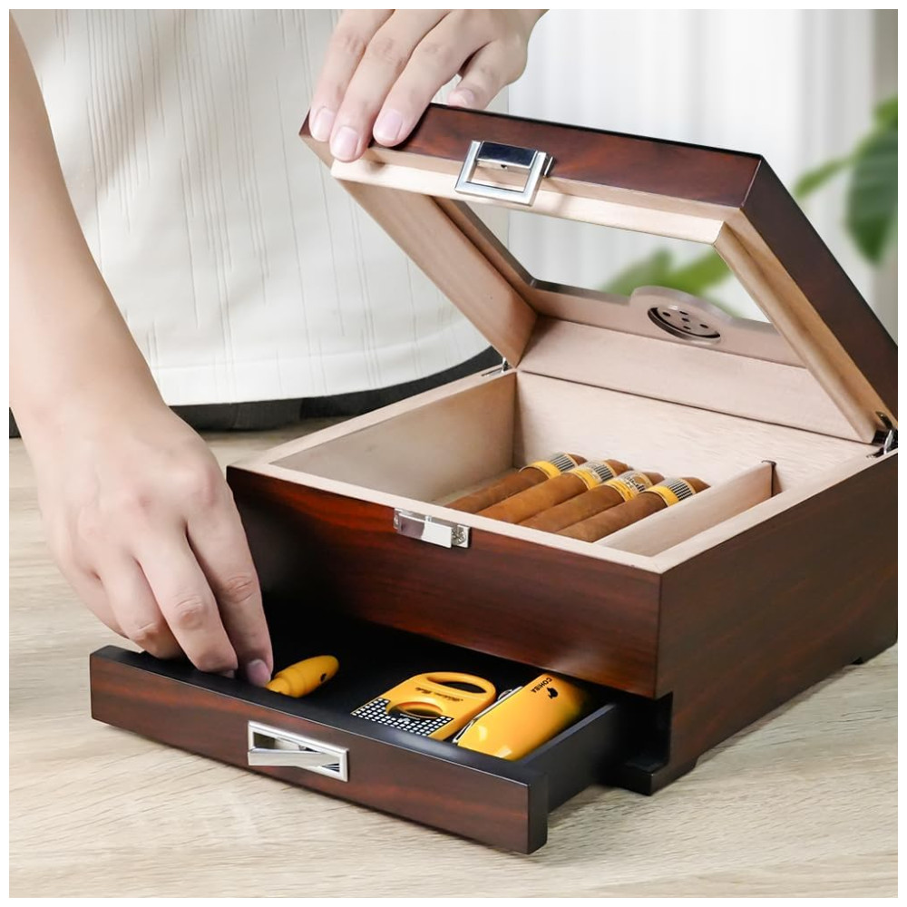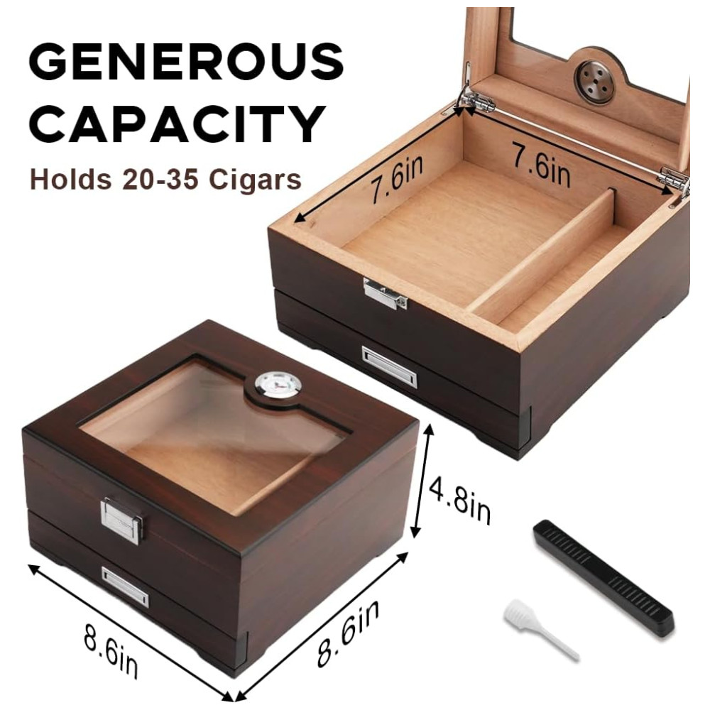 Umidor para Charutos Bald Eagle Feito à Mão em Cedro com Umidificador e Higrômetro Com Gaveta para Acessórios e Capacidade para 30-35 Charutos
