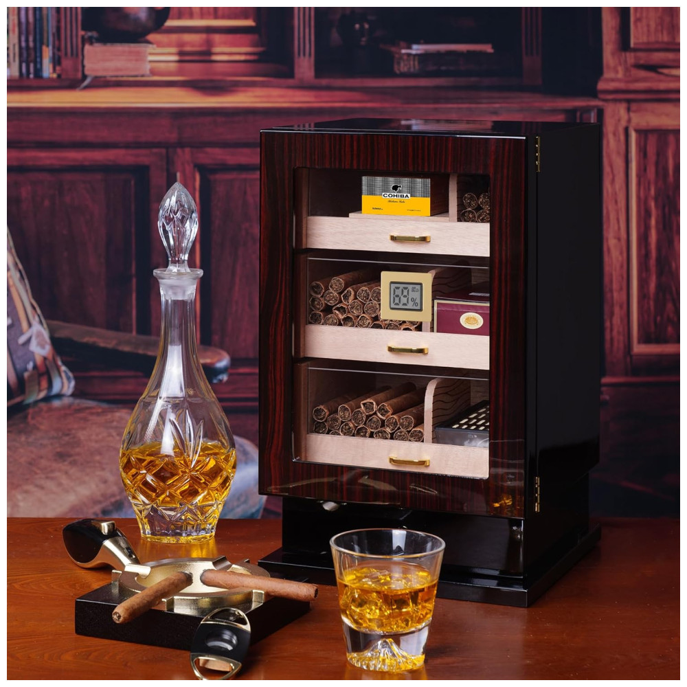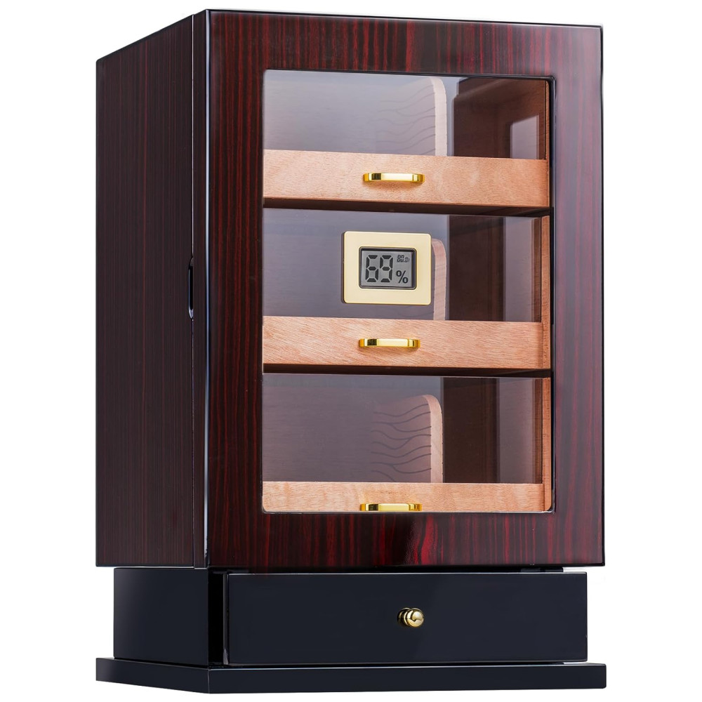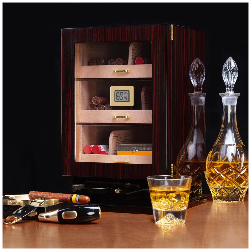 Controle de umidade de precisão! O Armário Umidificador Woodronic inclui 2 umidificadores de cristal em gel e um higrômetro digital preciso para monitoramento em tempo real, garantindo distribuição uniforme de umidade, controle de umidade duradouro e condições estáveis para manter os charutos frescos e saborosos. Com vedação hermética para manter a frescura, a porta magnética de cedro com design transparente permite exibir e monitorar sua coleção sem abrir o umidificador, preservando a umidade interna. Com capacidade para 100-150 charutos, bandejas e divisórias ajustáveis de cedro espanhol para organização ideal. Gaveta de armazenamento conveniente para acessórios mantém seus itens essenciais organizados e ao alcance. Design de qualidade elegante com exterior em ébano de alto brilho e interior em cedro espanhol envelhecido para aroma rico. Um presente excepcional para apreciadores de charutos.