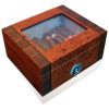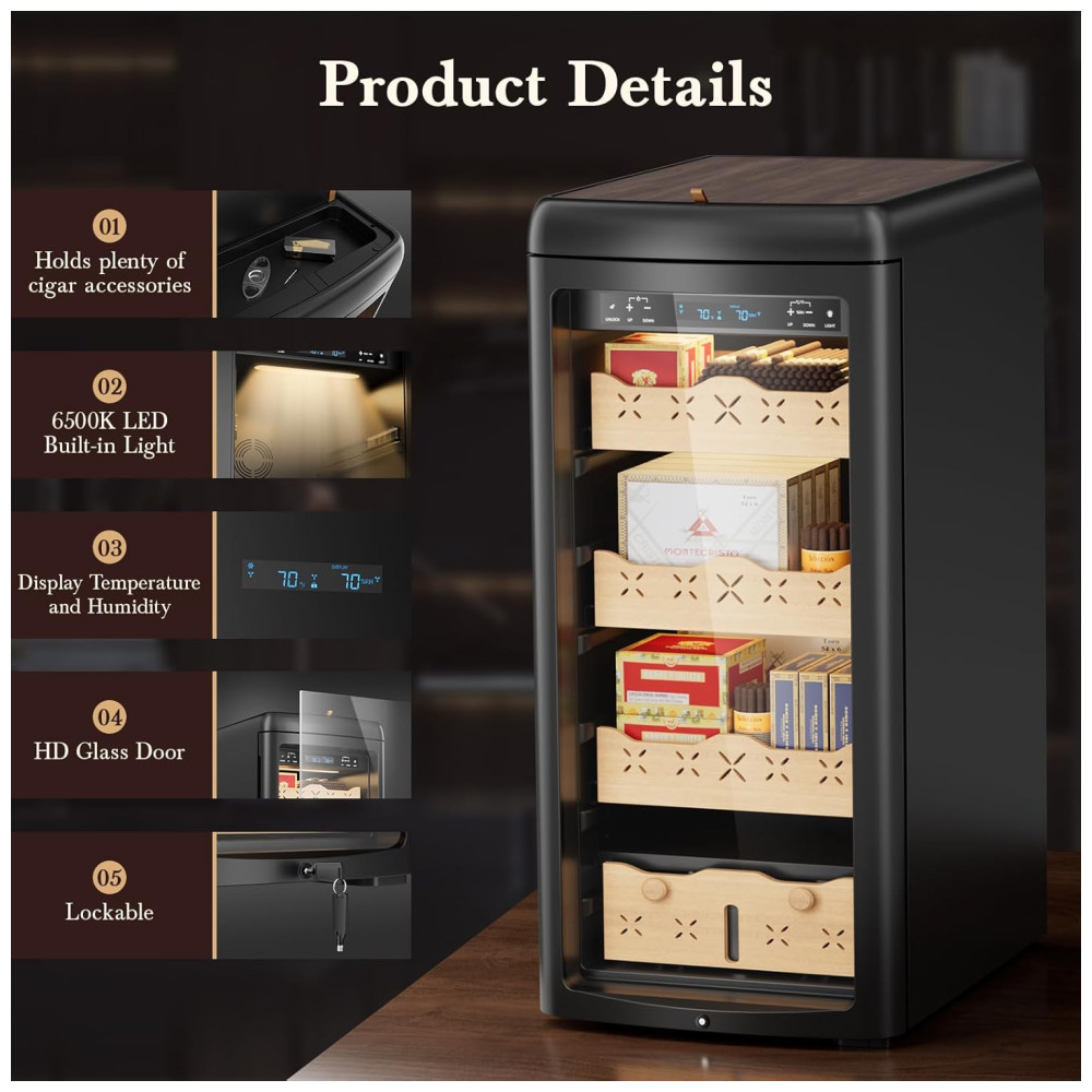 Fabricado em estrutura de madeira de cedro espanhol de alta qualidade, este umidificador emite um aroma natural ao abrir a porta, hidratando seus charutos e evitando que ressequem e fiquem mofados. Com capacidade extra grande de 900 charutos, recortes nas frentes das gavetas e prateleiras para melhor circulação de ar, iluminação embutida de 6500K e porta trancável para garantir a segurança de seus charutos, este umidificador é perfeito para a sala de estar, escritório, quarto ou adega.
