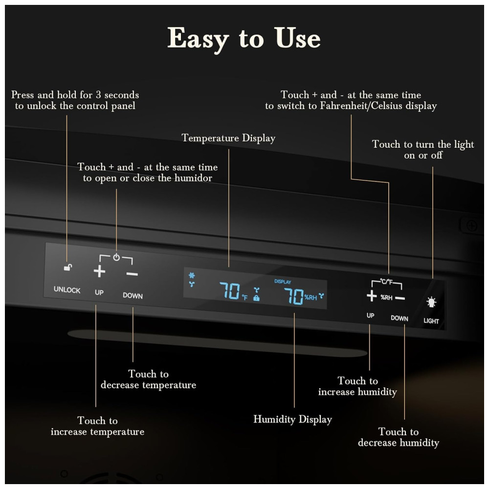 Este umidificador 6575 RH é ideal para manter a umidade constante em seu ambiente. Ele possui um sistema de detecção de umidade que ajusta a umidade no umidificador de acordo com sua configuração em tempo real, mantendo a umidade constante após apenas 1.020 minutos de ajuste. Além disso, ele possui funções de aquecimento e resfriamento para manter a temperatura constante dentro do umidificador, garantindo que seus charutos estejam sempre no ambiente de temperatura mais adequado.