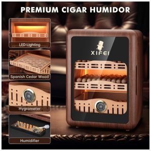 Fabricado em estrutura de madeira de cedro espanhol de alta qualidade, este umidificador emite um aroma natural ao abrir a porta, hidratando seus charutos e evitando que ressequem e fiquem mofados. Com capacidade extra grande de 900 charutos, recortes nas frentes das gavetas e prateleiras para melhor circulação de ar, iluminação embutida de 6500K e porta trancável para garantir a segurança de seus charutos, este umidificador é perfeito para a sala de estar, escritório, quarto ou adega.