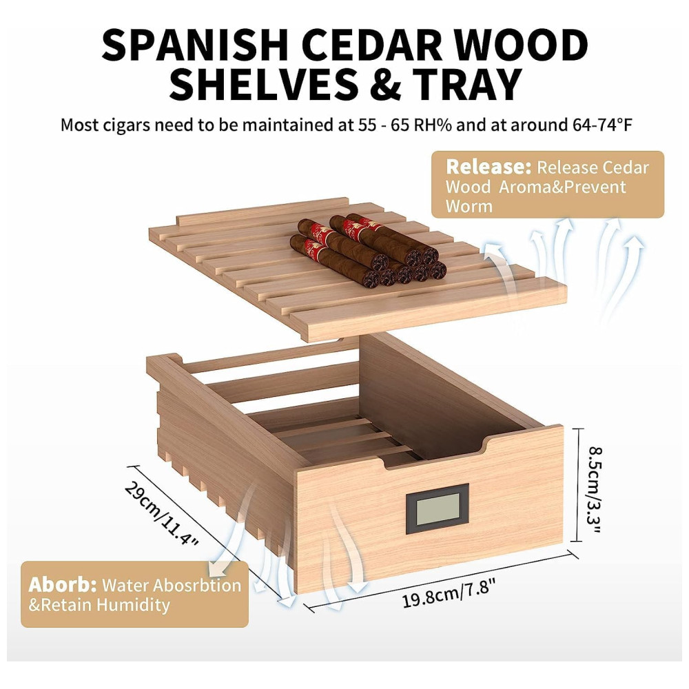 Madeira de Cedro Espanhol & Built-in Digital Hygrometer: Feito de madeira de cedro espanhol sem pintura, este cooler realça o envelhecimento, aroma e sabor da sua coleção. O aroma natural permeia as prateleiras e a gaveta. Bandejas removíveis e gavetas atendem às necessidades de armazenamento. Monitore a umidade com precisão com um visor numérico incorporado (Precisão: ±5% RH).