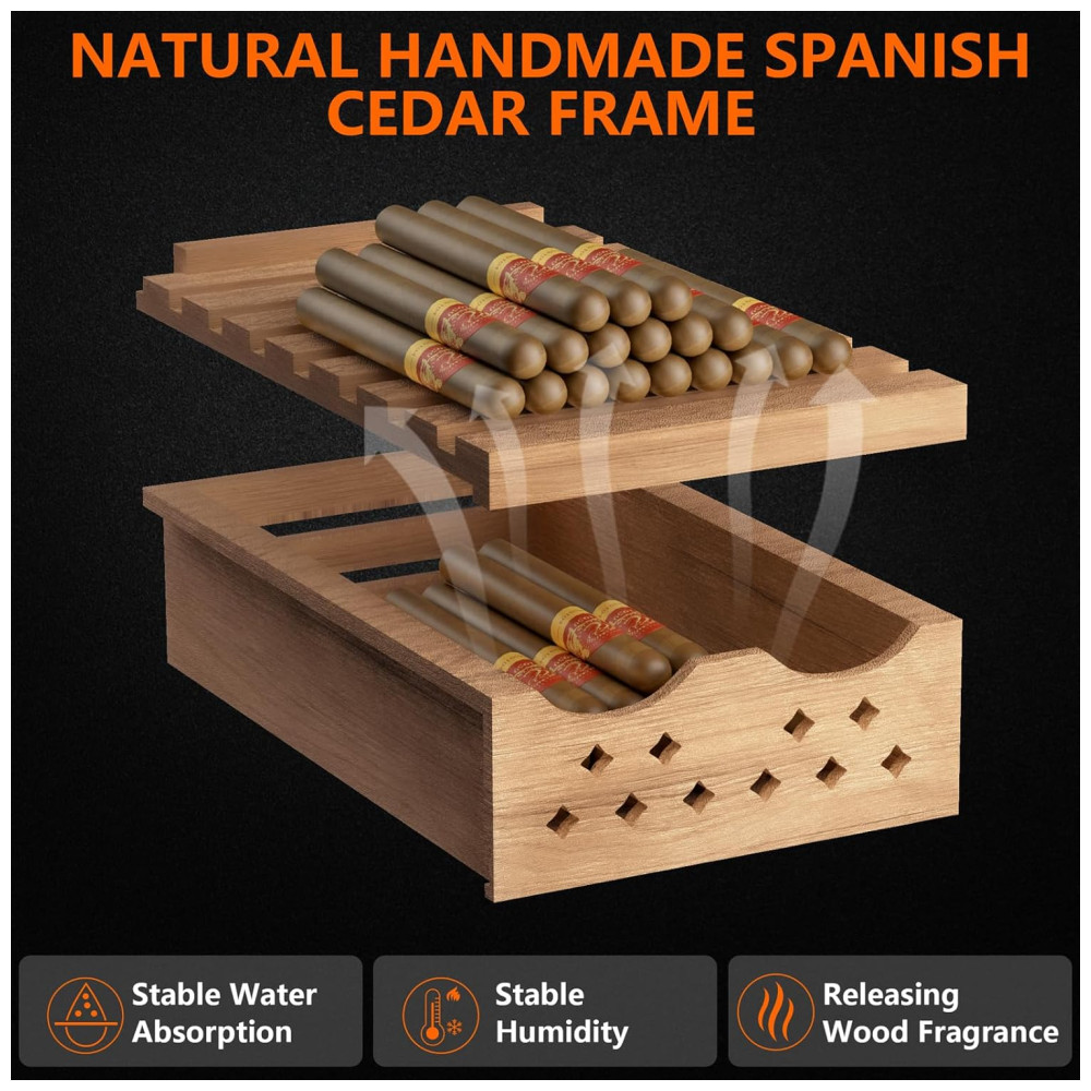 Material Natural: O armário humidificador é feito com estrutura de madeira de cedro espanhol de alta qualidade. A madeira de cedro natural libera lentamente um aroma fresco, proporcionando um ambiente hidratante e respirável, além de prevenir o ressecamento da sua coleção.